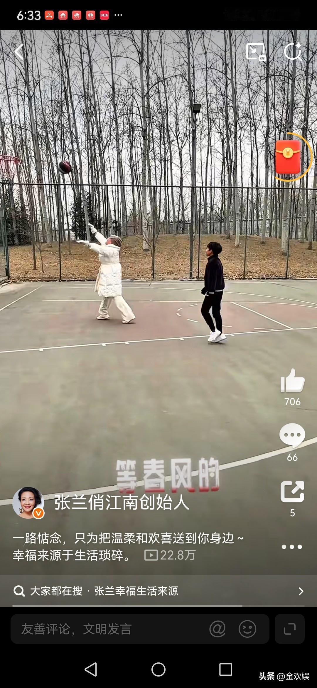 张兰,又晒孙子孙女了! 1月25日下午,张兰在自己的社交平台上晒一段视频,孙子箖箖正脸照曝光。 视频中,张兰开心地带着从台北回来北京的孙女及孙子小玥儿姐弟逛街及打篮球。 祖孙三人都穿着厚厚的衣服,玥儿和奶奶都戴着帽子,可见,北京的天气很冷! 几个月没见,玥儿姐弟都长高了许多,11岁的玥儿快与奶奶一样高了,已经到奶奶的眉心那了,她长发飘飘,背影神似生母大S。 小玥儿一直背面出镜,明显躲着镜头,怕被奶奶偷拍。 9岁的孙子小箖一身黑衣加白波鞋,身材瘦长,很活泼,他与奶奶一起打篮球,很开心的样子,他对出镜无所谓,在打球时正脸大方出镜了,笑得很开心,眉眼酷似汪小菲。 出生于1958年的张兰今年已经67岁了,但她活力四射,打篮球时动作敏捷,宝刀未老,她年轻时读高中是学校女篮队员,几十年过去,她老功底依然在线。 显然,孙小孙女放寒假回来,张兰很高兴,这也是她一直以来想要的幸福,如今,竟轻易圆梦了,晚年可以含饴弄孙,她是个幸福之人。