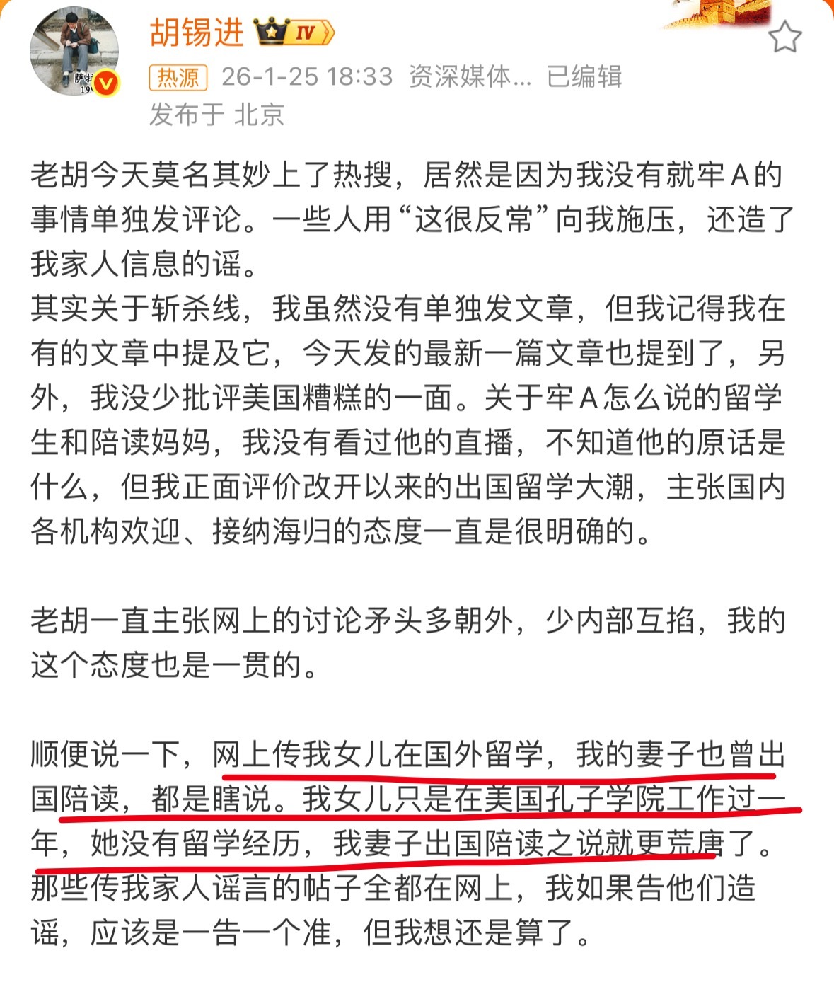 胡锡进就牢A斩杀线发评论老胡出来辟谣网友评论了:说自己的女儿没有留学经历,老婆也