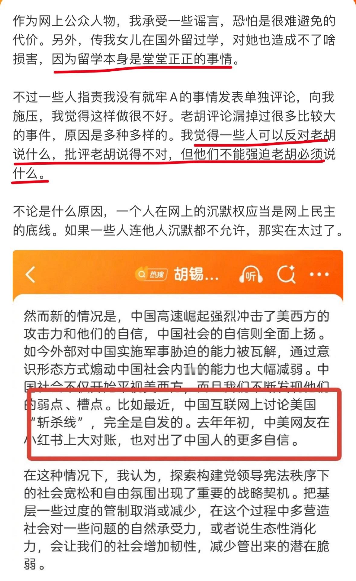 胡锡进就牢A斩杀线发评论老胡出来辟谣网友评论了:说自己的女儿没有留学经历,老婆也没出国陪读过,都是谣言。老胡还说,留学本就是堂堂正正的事情。网友可以批评说他说的不对,但是不能强迫他必须说什么。