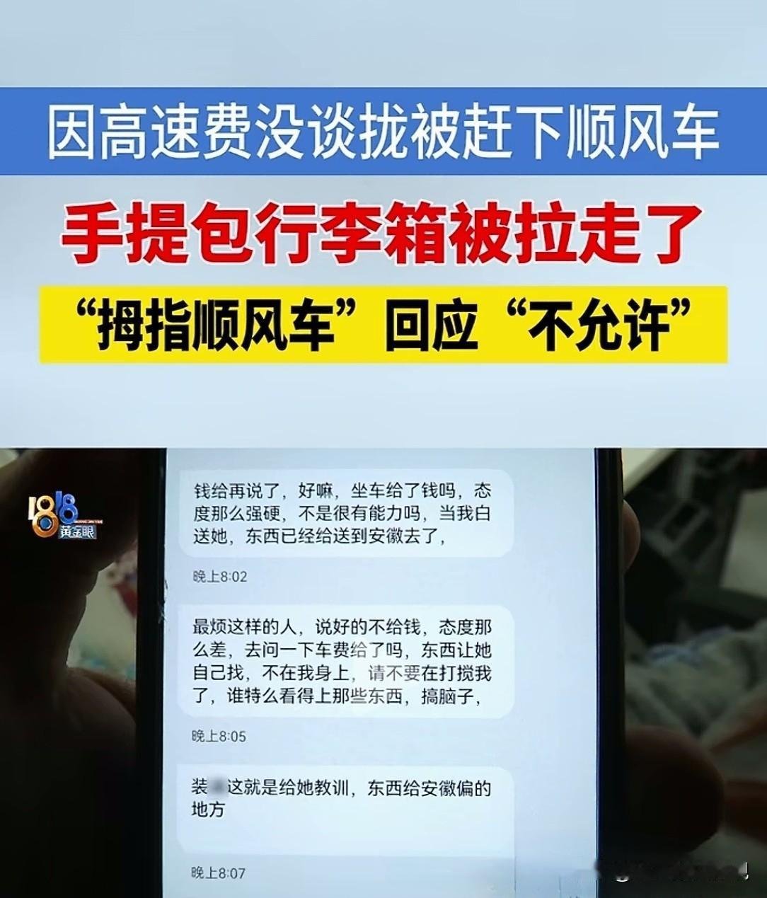 浙江宁波,女子回杭州,在某平台下单了顺风车,车费是112.77元,高速费勾选的协调平摊,但家人发现车牌和下单信息不符。到达目的地后,别的乘客下车,司机拦下女子,让她支付70元的高速费,女子拒绝,没想到,司机一脚油门跑了,把她装有身份证、银行卡、现金的手包,和行李箱拉到了安徽,让她拿3000块钱车费。  1月11日,刘大姐从宁波回杭州萧山,她自己不会下单,儿子帮她在平台下单了顺风车,车费112.77元。 车辆按时来接人,刘大姐在放行李时,发现接人的车,和下单的车牌号信息不对,当时就起了疑心。 追问时,司机让他们不用在意车牌号,把人送到就行。 家人看车已经来了,车上还有两个乘客,提供的电话也对,就让刘大姐上了车。 车上一共三个人,一路也算顺利,到了目的地后,另外两名乘客已经下车。 不料,司机却拦住刘大姐不让她下车,让她掏70块钱的高速费。 还问她,这钱是你出,还是你儿子出? 刘大姐不知道儿子下单时的情况,赶紧联系了儿子。 刘大姐的儿子告诉她,自己选的是协商平摊高速费。 可司机就是拉着刘大姐不放,刘大姐的儿子说明情况后,司机还不让走。 刘大姐的儿子解释说,自己选的是平摊高速费,要拿也是三个人一块拿。 刘大姐的儿子表示,全程150公里,一直走高速的话,费用在七八十块钱。 可司机却说他有录音,当时说好是刘大姐这边掏高速费。 刘大姐的儿子让司机把录音放给他听,如果是真的,自己不但掏70块钱,还给他道歉。 不料司机暴躁起来,称要把刘大姐拉到派出所去。 司机去拉刘大姐的胳膊,想把他拉下车。 刘大姐害怕司机动手打他,如果自己吃了亏,连个证据都没有,坚持不下车。 但最后刘大姐还是被司机扯下来,车门还没关好,行李也没有拿,司机一脚油门就跑了。 刘大姐彻底崩溃,坐在那里发抖,她又联系了儿子,并马上报了警。 刘大姐的手包里有身份证、银行卡,还有几百块钱的现金。 行李箱里也有其他东西,不知道被司机拉到哪里去了。 儿子从宁波赶过来,他们求助民警,民警当天联系上了司机后,他称自己没空。 司机让刘大姐他们去上海拿行李,再后来,司机的电话就彻底打不通了。 刘大姐担心自己的身份证和银行卡出差错,急的不行。 事后,记者联系了顺风车司机,电话打不通,信息也不回。 记者又联系了最初接单的司机陈师傅,对方表示他把单转给了现在的那个司机,现在也联系不上。 记者追问,平台是否允许私下转单? 司机称,当时他不想接单,就把这一单转给了位置离的比较近的司机,并称顺风车可以这样操作。 经查,平台规定,不允许私下转单。 事情投诉到平台后,平台只给刘大姐退了车费,并对司机账号封禁。 但对司机拉走客人行李的事,平台目前联系不上司机。 让刘大姐联系最初接单的陈师傅,因为他转单后,平台没有接单司机的信息。 后来刘大姐被告知,她的行李已被送到了派出所,但具体哪个派出所不知道。 也就是说,目前刘大姐的行李仍无准确下落。 记者追问,专员是从哪里得知这个信息的?但具体核实后,客服也不知道。 记者给客服留下了联系方式,但没有收到任何回复。 之后,记者收到了实际接单司机的消息。 司机称,刘大姐车付已经退款,但说好的70元高速费都不给,态度还差。 信息中,司机言语恶劣,并称把行李送到了安徽很偏的地方。 刘大姐想要行李,到安徽去拿,或者拿3000块钱来回的车费。 司机说他看不上那点行李,刘大姐的儿子很硬气,这是给他们一个教训。 他还很狂妄的怼记者,民警都拿他没办法,就你有办法吗? 让记者不要打搅他,不然投诉记者。 刘大姐气炸了,这哪里是顺风车司机,这不是敲诈吗? 可平台也没办法,只推脱说会尽量帮她找到行李。 目前平台联系不到司机,至今刘大姐的行李也不知道在哪里。 刘大姐表示,他们按着平台规则下单。 明确勾选的是协调平摊,凭啥让她一个人掏,这不是欺负人吗? 可司机却坚称,顺风车本来就便宜,坐车还不掏高速费,现在车费也退了,这家人就是在白漂。  依据《民法典》中的相关法律,顺风车司机,应当在约定期限,或者合理期限内,将旅客、货物安全送到约定地点。 刘大姐下单成功,司机应将乘客安全送至杭州萧山,并将其行李妥善保管并送达。 然而,司机因高速费纠纷,强行拉拽刘大姐下车,还将其装有身份证、银行卡和现金等物品的行李带走。 这就是未将行李安全送到约定地点,明显违反了合约。 按规定来说,乘坐顺风车时,司机无权随意处置乘客行李。 有人支持顺风车司机:几十块钱的事,当时给了不就完了吗,司机也不容易,搞成这样好了,几个70元也有了。 有人提醒,平台叫车和实际车牌不一样的,千万别上车,宁可从新叫车,不然出了事平台处理不了。 目前,刘大姐考虑走法律程序,拿回自己的行李。 对此你怎么看?
