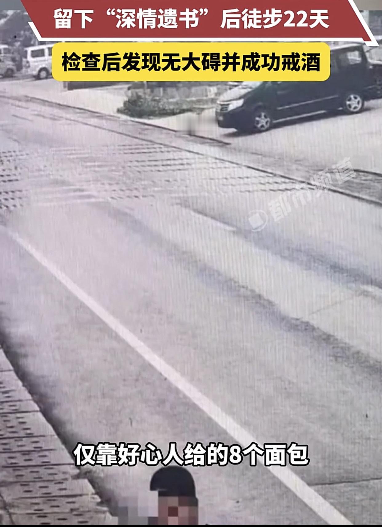 22天,仅靠8个面包6根红薯一瓶水,徒步200多公里,神奇般把病却“治好”了! 湖南湘潭一名46岁男子,娄底新化人,到湘潭做上门女婿。他在两年前被诊断出患有肝病,之后一直在家呆着,靠酒消愁,老婆干脆也到外地打工。去年12月15日,终日无所事事的男子留下了一封遗书,手机和钱包,徒步走回老家。此时他只有一个想法:就算死,也要死在阔别20年的老家,不拖累任何一个人,就匆匆走出湘潭的家, 岳母回家发现后立即告知在外打工的女儿以及男子的姐姐,他们一致认为他可能已经轻生,然后急匆匆报警寻求帮助。经多日调查,警方通过监控发现该男子的踪迹,一路沿线寻找,终于在娄底新化男子老家找到了该男子。 整整22天,男子一直在走,只睡过一夜,一共吃掉好心人给的8袋面包6个红薯和一瓶水。更神奇的是,男子在娄底一家医院复诊,医生未发现异常,也就是说,男子的肝病不治自愈了。其实,很多病饿一饿就能好,男子这二十多天,一饿,不停的运动,激发了人身上的某种潜力,并停了酒,这也许是好的原因吧。(来源:潇湘晨报) 男子这份为家人着想的心意重千斤,万幸身体无大碍,总有人把爱藏在默默付出里,却忘了家人最在意的从不是利弊,而是你平平安安陪在身边。