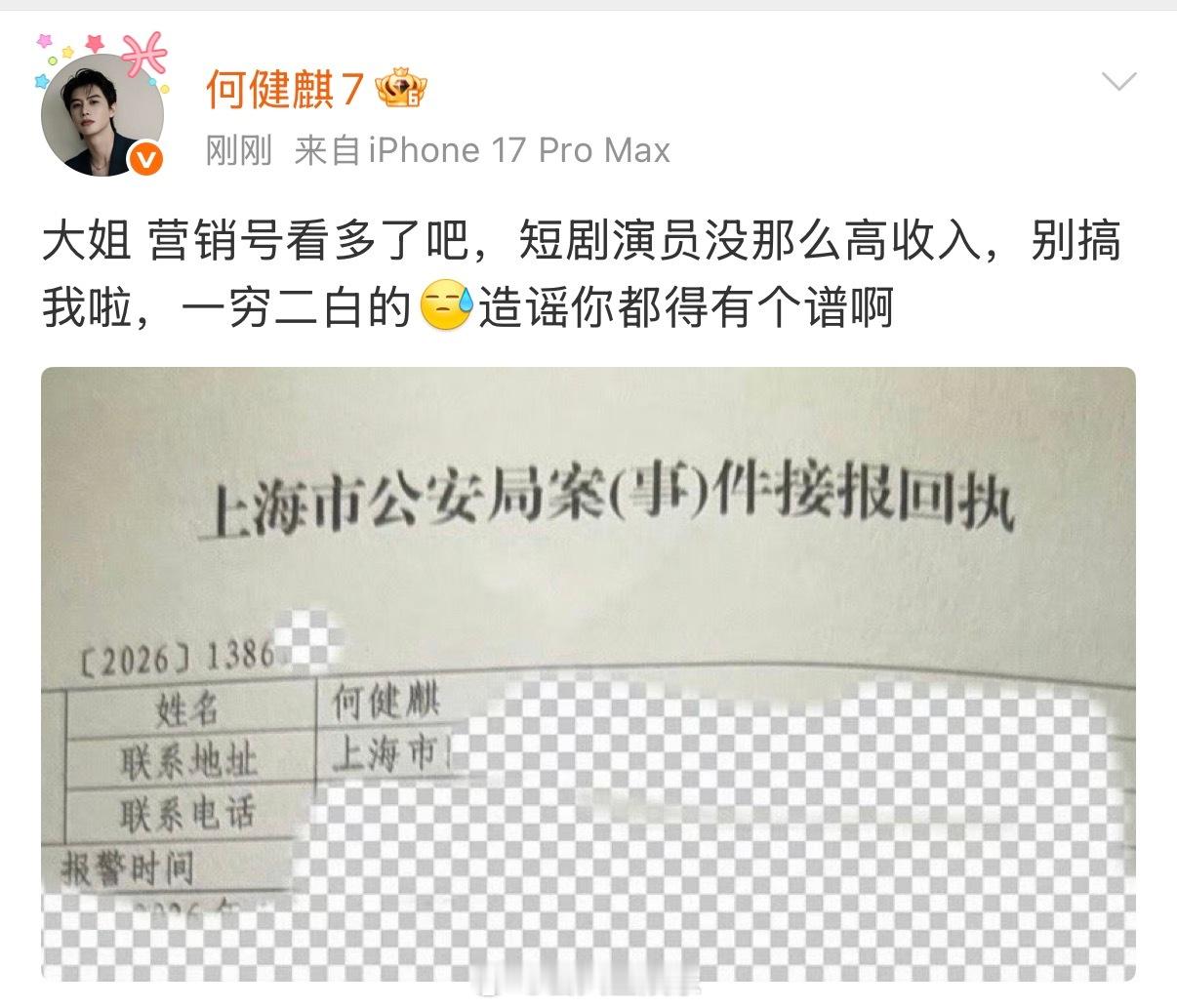 何健麒本人晒报案回执回应,“短剧演员没那么高收入,别搞我啦,一穷二白的,造谣你都