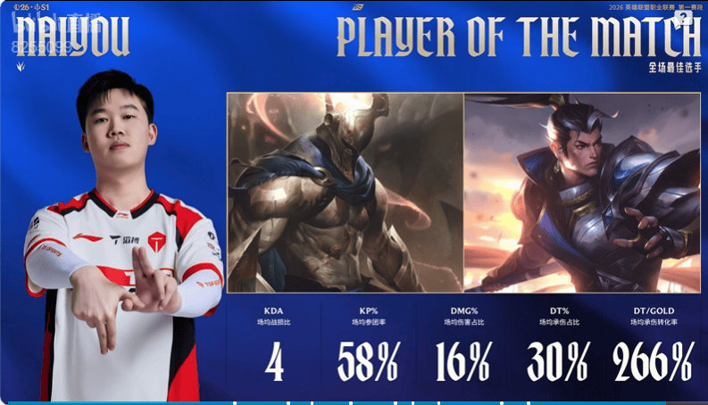 虎扑01月25日讯Naiyou使用潘森和赵信拿到TES对阵IG的全场MVP
