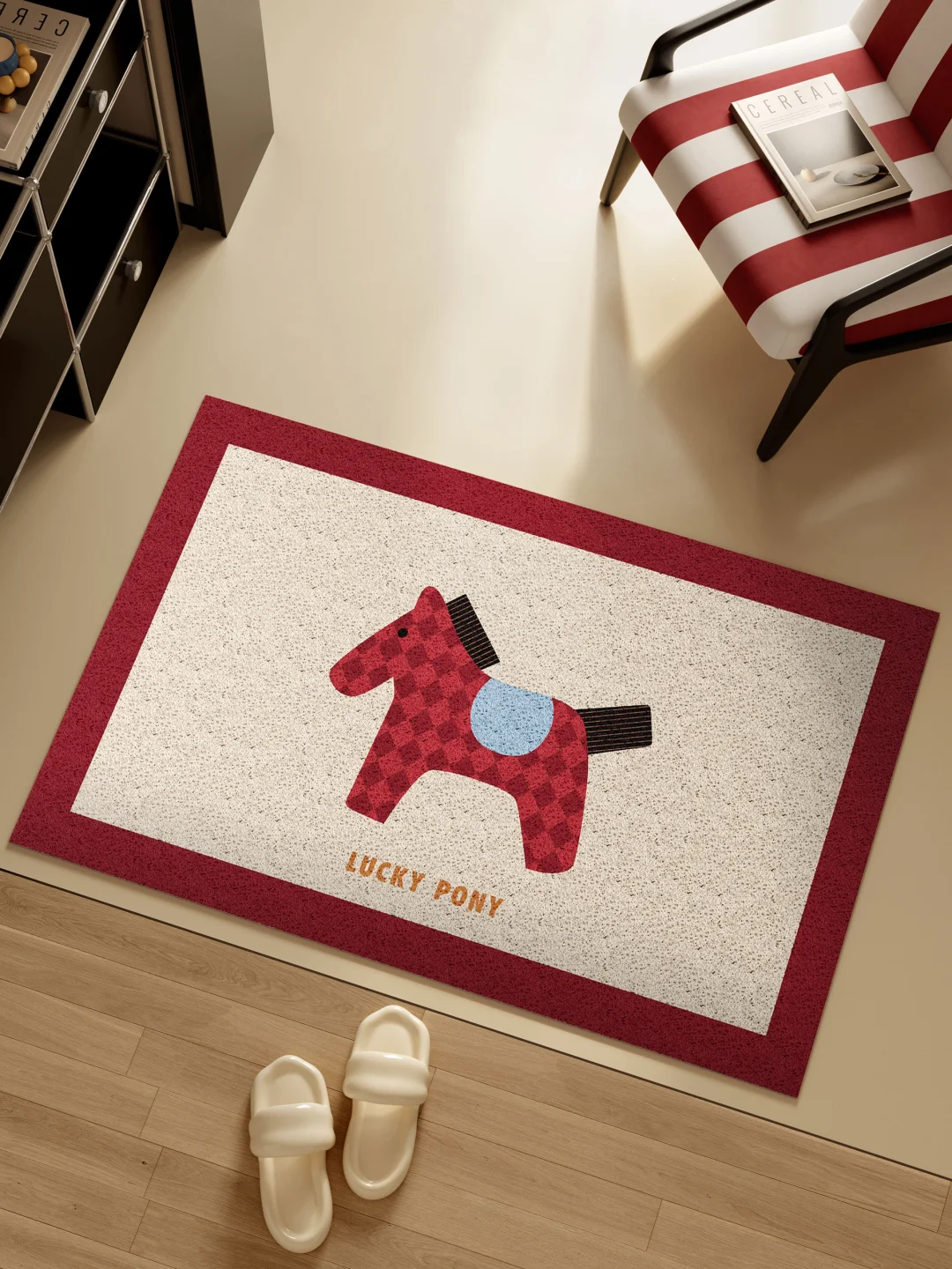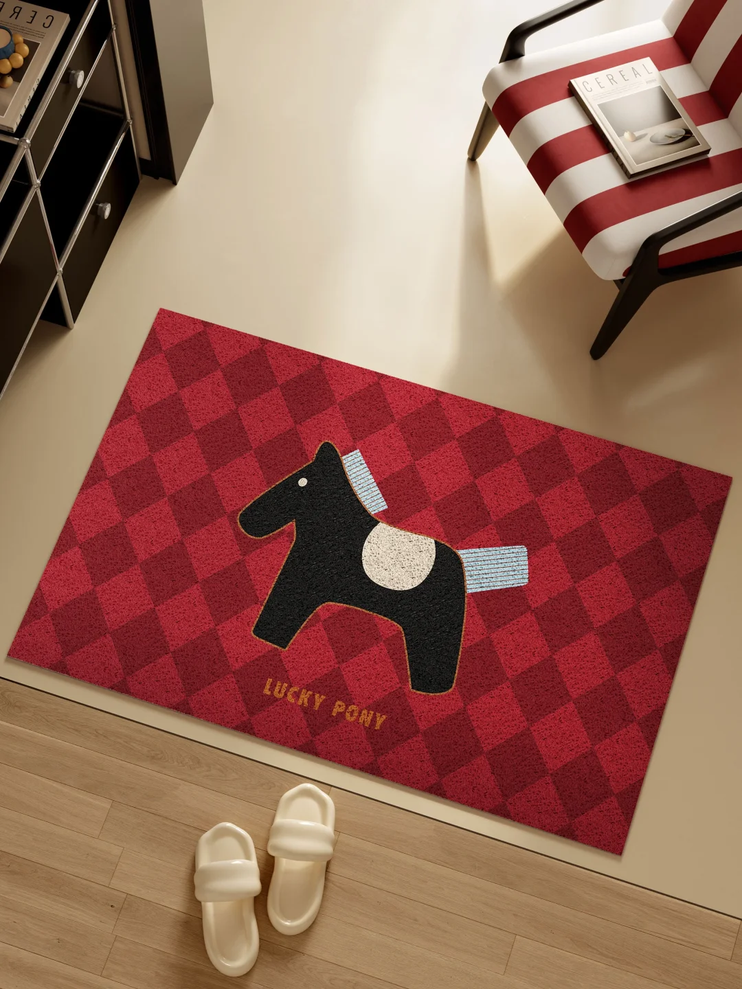 正红底色自带复古调 喜庆又大气 马年专属的小马造型 菱格纹时髦感拉满 可爱中还透着高级感 - 丝圈材质太懂懒人了 鞋底泥沙一蹭就干净 脏了直接冲水洗就行