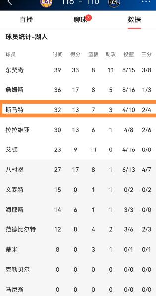 湖人悍将斯玛特真是让人肃然起敬!在今天湖人客场以116:110力克独行侠的赛后采访中,斯玛特透露了一个不为人知的故事。 今天NBA常规赛的一场焦点战,湖人客场挑战独行侠,最终以116-110险胜对手,这场球打得是真跌宕起伏,完全称得上一波三折。 上半场湖人手感火热,一度建立起14分的领先优势,可谁能想到第三节突然断电,单节只拿到14分,被独行侠打出35-14的攻击波,直接从领先13分变成落后8分,眼看就要崩盘。 好在湖人末节及时觉醒,打出强势反击,用一节37-23的比分完成逆转,成功拿下这场关键胜利,稳固了西部第五的排名。 这场逆转之战,除了东契奇的33+8+11和詹姆斯末节的11分救主,最让人动容的,当属湖人悍将斯玛特。 赛后采访时,斯玛特才透露了一个不为人知的细节,听完让人心里一紧。 他说自己在第四节一次破坏对手球权的时候,右手食指不小心脱臼了,可当时比赛正处于最关键的时刻,他根本不想被替换下场,不想因为自己影响球队的逆转势头,于是就当场弯下腰,硬生生把脱臼的手指掰了回去,接着重新投入比赛。 没人知道他当时有多疼,要知道,斯玛特的右手食指之前还做过韧带修复手术,本身就有旧伤,这次脱臼无疑是雪上加霜。 而且他还坦言,自己从来都是这样,不管遇到什么意外,只要还能坚持,就绝不会轻易下场,“这就是比赛的一部分,这就是我,我是个坚韧的球员,无论我还有十根手指还是九根,都想帮助我的球队”。 说白了,斯玛特这么做,不是鲁莽,也不是逞强,而是刻在骨子里的拼劲。 整场比赛他出战32分钟,10投4中拿到13分7篮板3助攻2盖帽,正负值高达+12,末节更是贡献关键补篮和盖帽,用实际行动证明,自己掰回手指继续战斗,不是徒劳。 了解斯玛特的人都知道,他从来都是这样一名球员,作为曾经的最佳防守球员,他的防守向来以强硬著称,不管对手是谁,不管需要防守哪个位置,他都不会有丝毫退缩,甚至经常用身体硬扛冲击,也正因如此,他的伤病从来没断过,过去两年就缺席了上百场比赛。 近期斯玛特的状态一直很好,过去七场比赛,他场均能拿到13.9分,投篮命中率和三分命中率都达到47%,效率远超以往。 湖人当初花2年1052万签下他,本来就是看中他的防守和拼劲,如今看来,这笔签约真的太超值了,他不仅能在防守端筑起屏障,关键时刻的韧性,更能给球队注入强大的士气。 当然,也有人会担心,这样硬扛伤病会不会留下后遗症,毕竟手指脱臼如果处理不当,很可能影响后续的发力和防守动作。 但对于斯玛特来说,球队的胜利永远排在第一位,这种对比赛的敬畏、对团队的负责,正是当下很多球员缺少的品质。 一场116-110的逆转,不仅让湖人收获了胜利,更让我们看到了斯玛特的硬核与坚韧。 他没有华丽的得分数据,也没有太多亮眼的高光时刻,但就是这种不抛弃、不放弃的拼劲,让人肃然起敬。 不过也有人有不同的看法,有人觉得这种硬扛伤病的方式不值得提倡,健康才是球员的根本;也有人觉得,这就是职业球员该有的样子。 对此你有什么不同的看法,可以在评论区留言讨论!!!