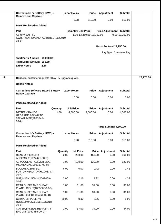 如果选择升级到90kWh电池,成本更是直线飙升。电池本体售价18000美元(现汇率约合12.6万元人民币),车主还需要额外支付4500美元(现汇率约合31409元人民币)才能解锁全部容量,再加上安装费用及必要的更换零件,总价高达23262美元(现汇率约合16.2万元人民币)。