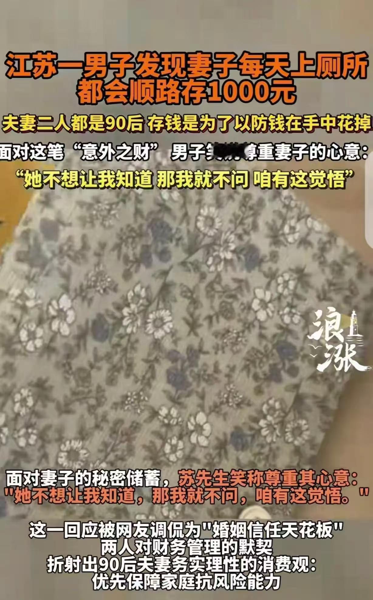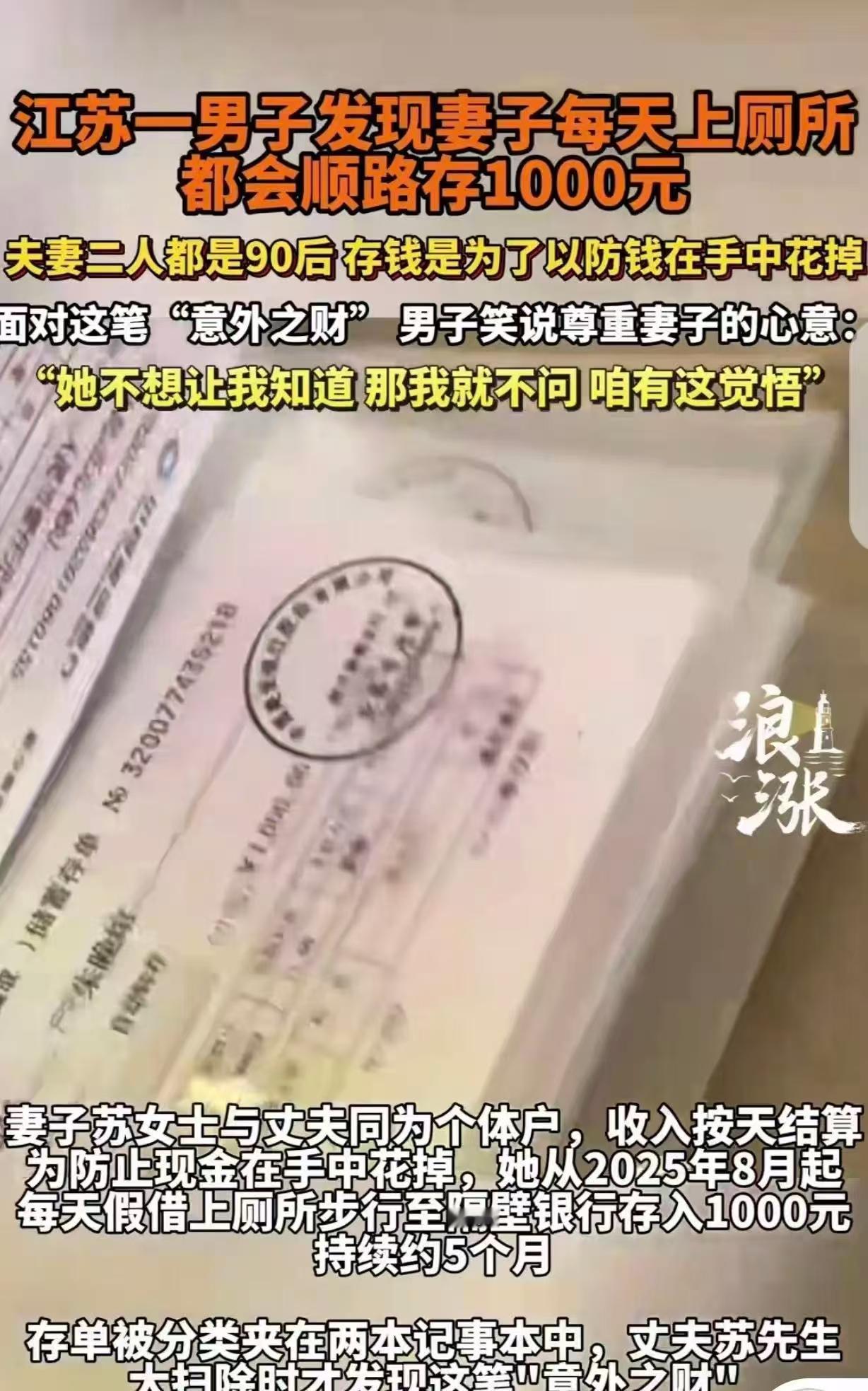 “意外之财!”江苏宿迁,一90后女子,家里明明有卫生间不用,每晚都借口出去上厕所,还偷偷带走1000元,一天,丈夫打扫房间时,竟翻出2本记事本,他打开后,里面的东西,让他眼睛都直了,竟然是200张千元存单,一共20万。丈夫恍然大悟:她不想让我知道,那我就不问,咱有这觉悟。 苏先生和妻子在宿迁经营小生意,收入按天结算。去年八月起,妻子养成了个奇怪习惯:每晚都说要去外面上厕所。家里明明有卫生间,她却总去隔壁银行网点的公共厕所。苏先生当时没多想,只觉得妻子可能不习惯家里的新马桶。 直到今年大扫除,苏先生在整理床头柜时发现两本厚厚的记事本。翻开一看,里面整整齐齐夹着约200张银行存单,每张面额1000元。他仔细算了算,总共大约20万元。这些存单按照日期排列,最早从去年八月开始,几乎每天一张。 苏先生把妻子每晚的“厕所时间”和这些存单联系起来,原来妻子不是真的去上厕所,而是借机去银行存钱。他们做个体生意,每天收入的都是现金。妻子担心钱放在手里会不知不觉花掉,就想出了这个“强制储蓄”的办法。 面对这笔钱苏先生显得很豁达,他笑着说既然妻子不想让他知道,那他就不多问。与父辈那一代“工资全交”的相处方式相比,现在超过40%的夫妻并不完全清楚对方的真实收入。适度保留财务隐私,在一些家庭中反而更能维持和谐。 丈夫的“不问”背后是信任,妻子的“隐秘储蓄”源于责任感。他们用各自的方式为家庭未来努力,既保持适当边界,又共同向前。 真正健康的家庭财务,不在于是否完全透明,而在于双方是否怀着共同目标。无论是公开管理还是私下积累,都是为了家这个共同体的美好未来。 各位读者你们怎么看?欢迎在评论区讨论。