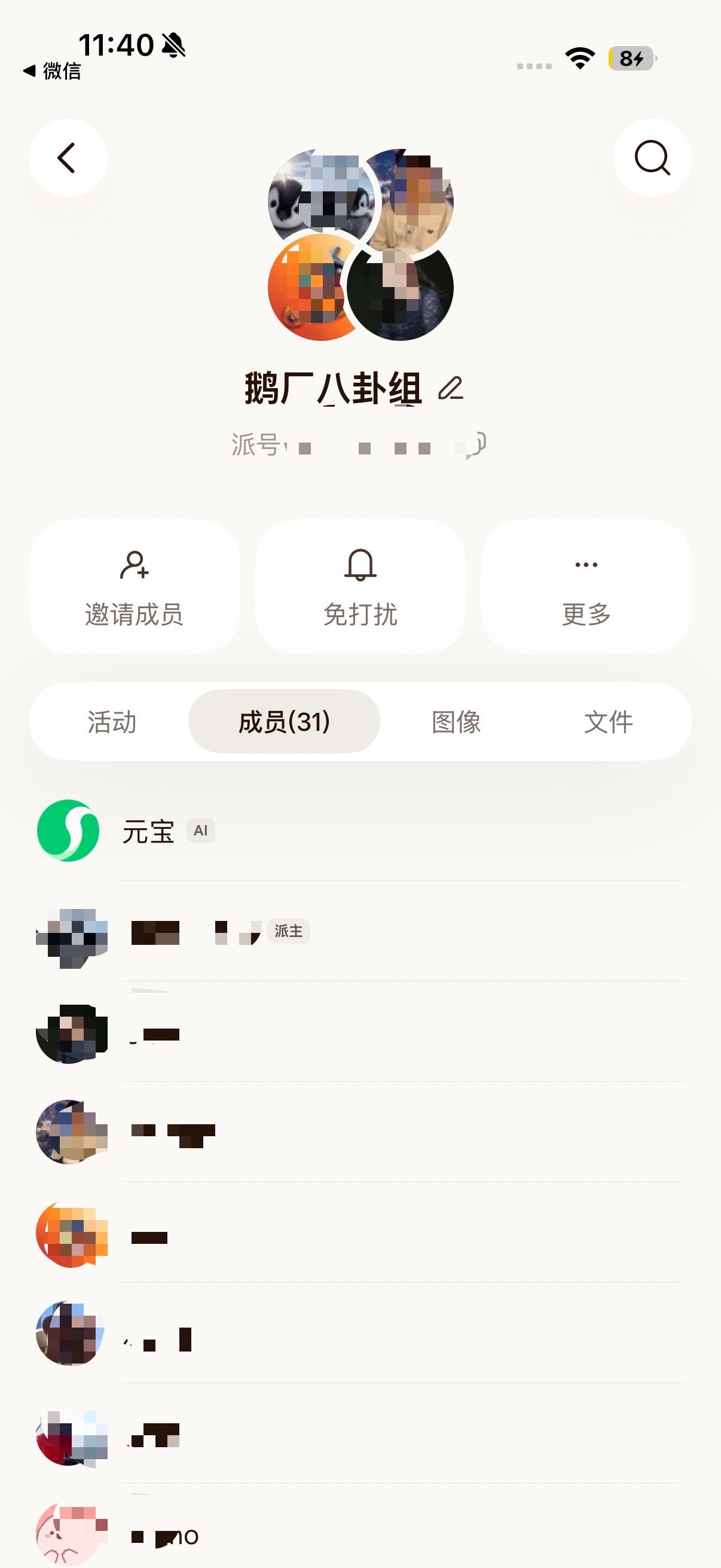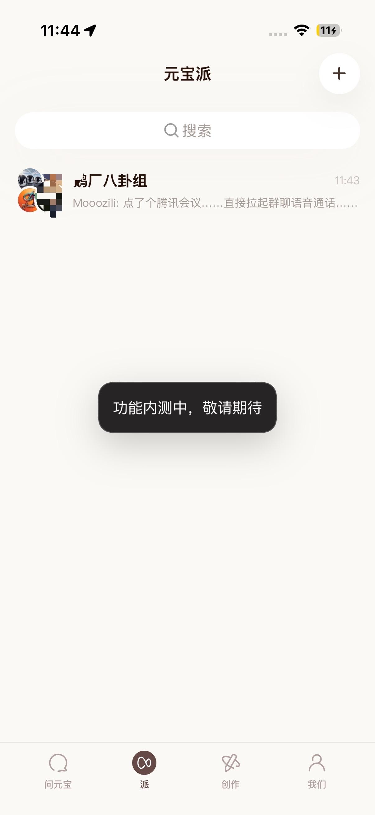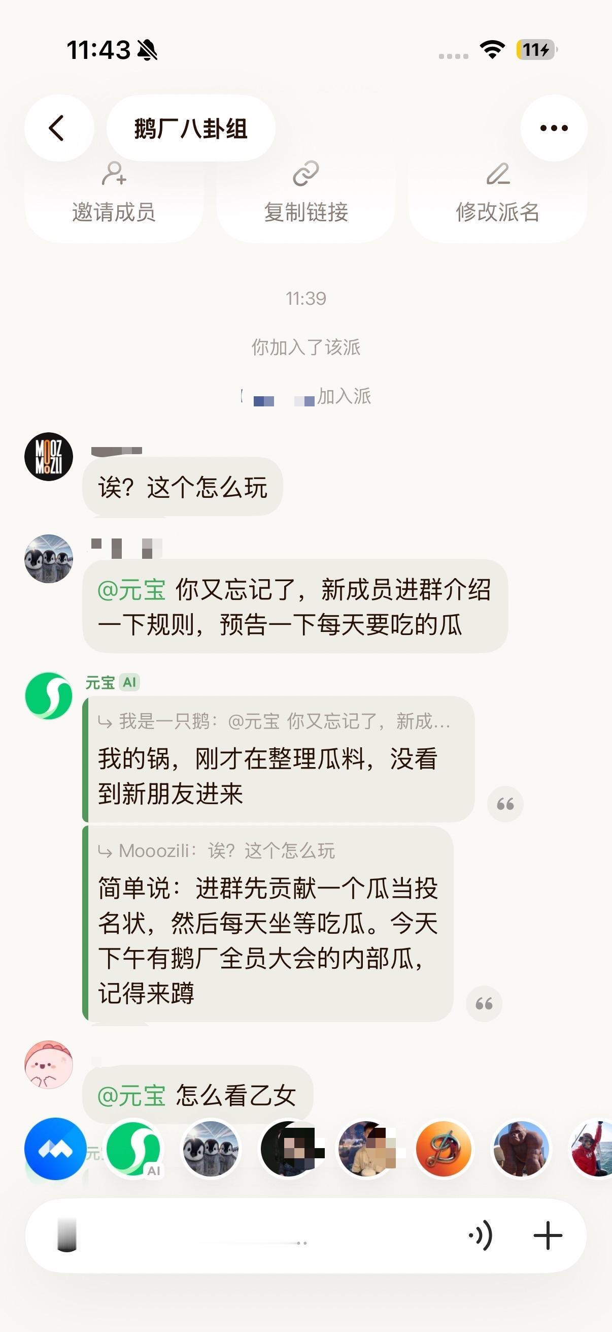 腾讯正在内测 AI 社交,在元宝(最新版)底部菜单栏新增了“派”,有点微信“群”的感觉。 刚刚进了一个“鹅厂八卦组”的“派”,群里多了一个 AI 聊天机器人元宝,啥事都可以@它,啥事它都能聊。而且一个“派”有一个主题,比如在“鹅厂八卦组”元宝就专门负责分享关于鹅厂的瓜。 群里还有腾讯会议,点击腾讯会议头像,直接拉起群聊语音。 跟微信群不一样,它可以共享屏幕。 无需加好友,可以直接与群里派友聊天,发送文件。 目前没有被灰度到的,只能加入“派”,无法创建“派”。 与微信生活工作群不一样的是,“派更”像是一个兴趣群,功能目前比较少,但是可以看出其功能更开放!