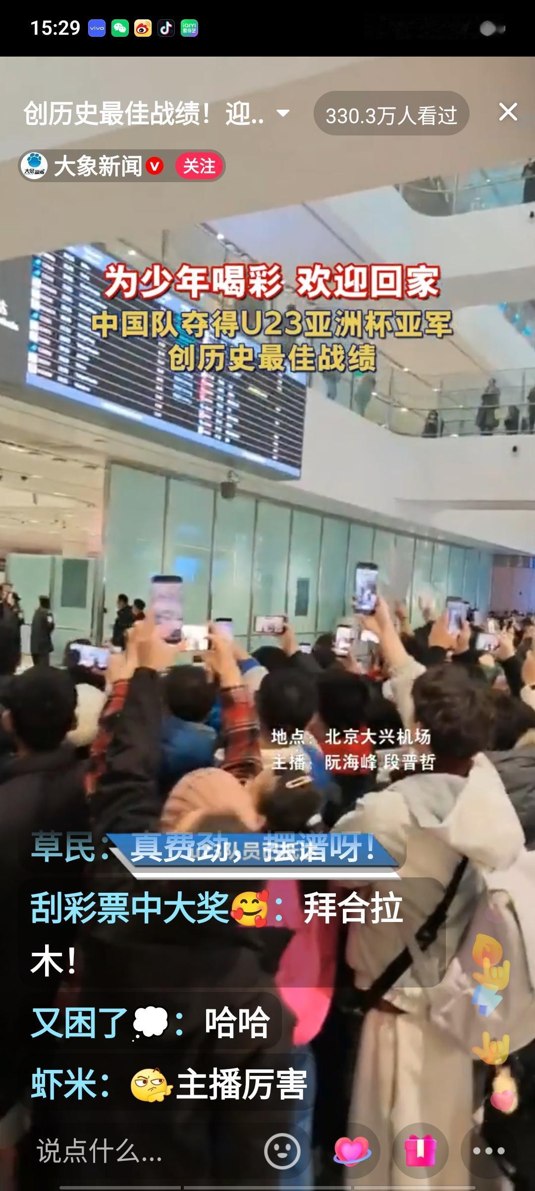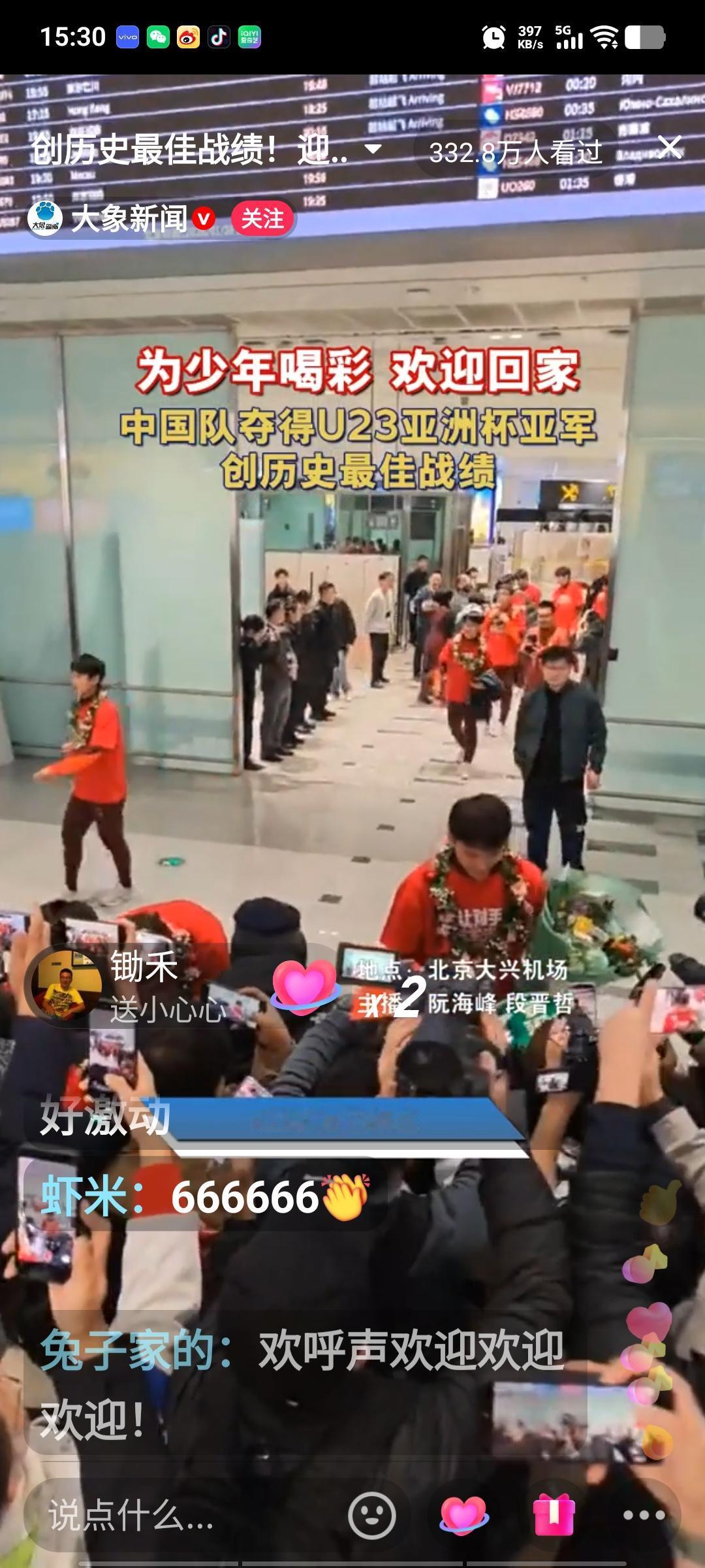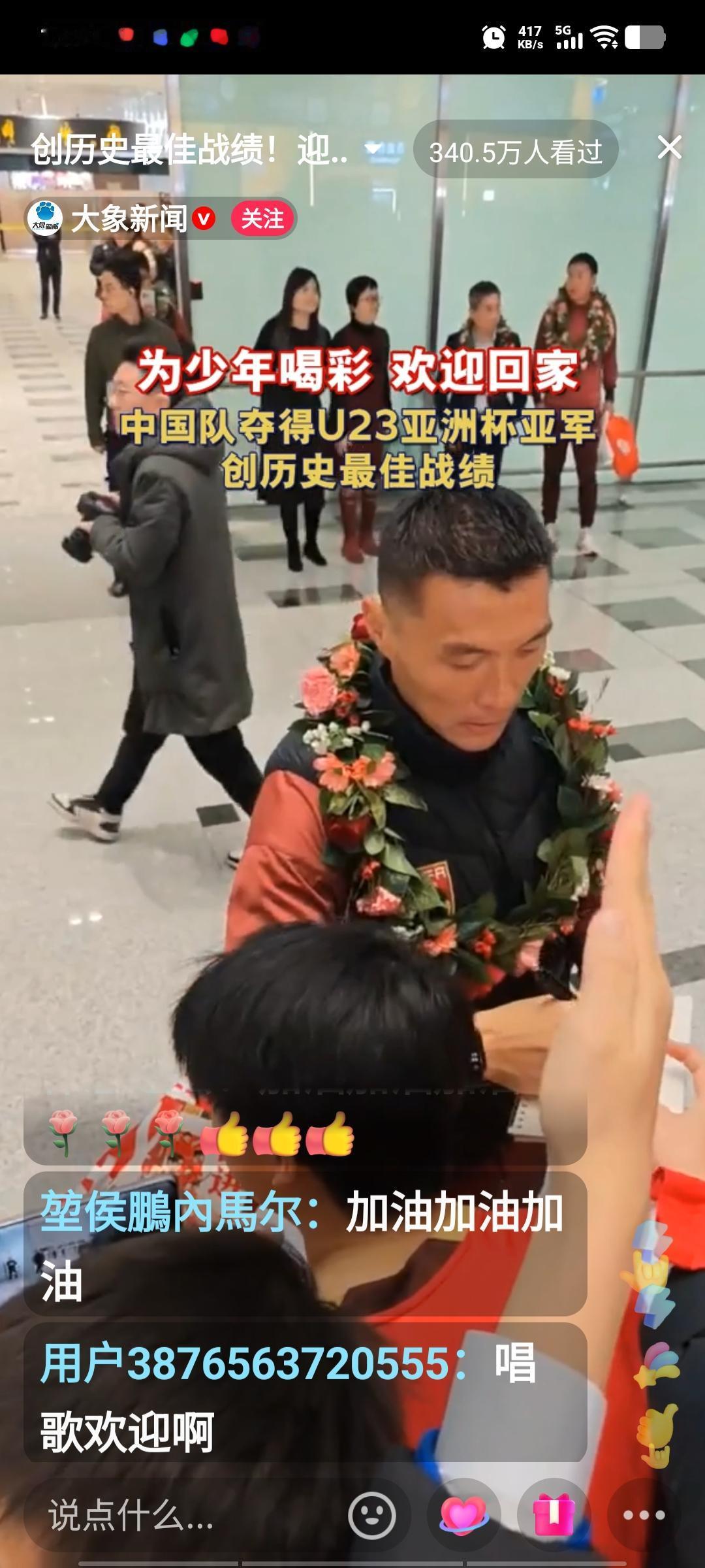 U23国足的小将们回国啦!就在刚刚,北京大兴机场一片热闹景象,几百名热情的球迷手捧鲜花,像迎接英雄一样欢迎国足小将。现场气氛十分热烈,足协领导为全队都戴上了花环。李昊和助理教练于大宝与球迷互动,为球迷签名,这届U23小将表现极为出色,他们创造了历史,斩获亚军,着实可喜可贺。期待在不久的将来,他们能越战越勇,总结经验教训,创造更大的奇迹。