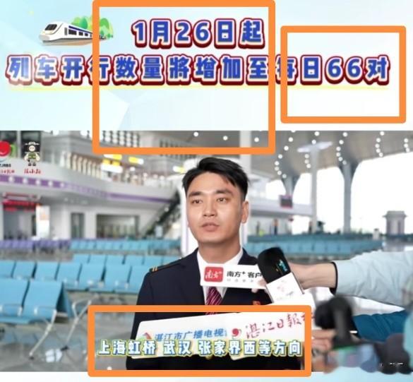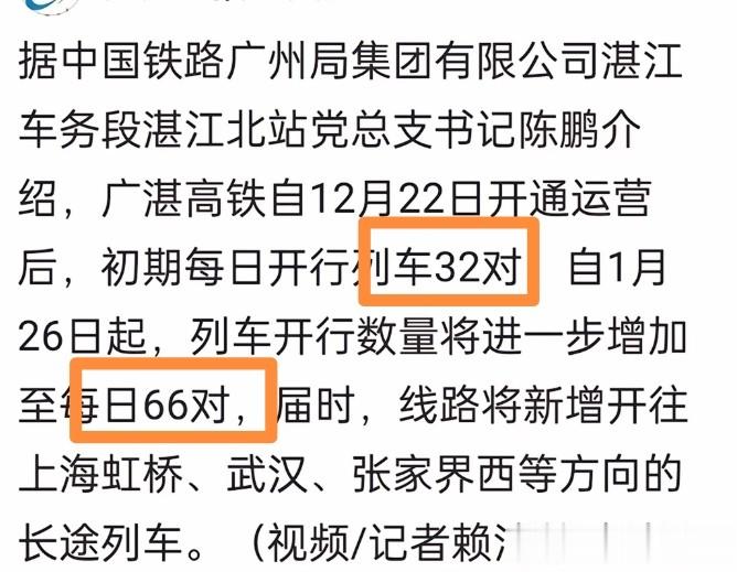 新消息,广湛高铁下个月将新增 34 对列车。目前,已有 32 对高铁往返于广州和湛江之间,但仍供不应求,因此还需增加 34 对,使列车对数增至 66 对,即 132 趟往返车次。