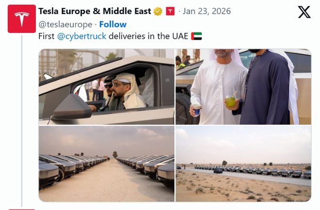 在阿拉伯联合酋长国,特斯拉完成了Cybertruck的首批交付,进一步拓展其全球市场。与斯洛伐克市场类似,Cybertruck在阿联酋当地电动汽车用户群体中同样引发了强烈反响。