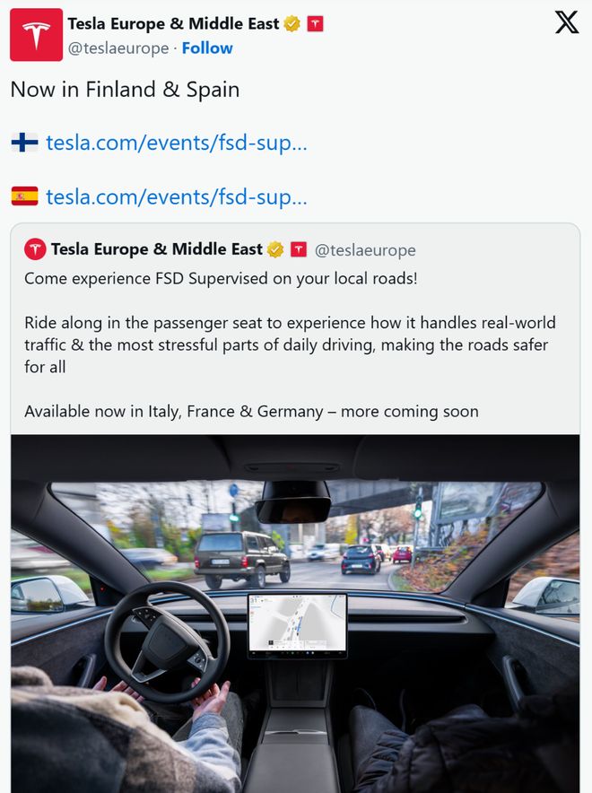 FSD监督版试乘体验活动最初仅在意大利、法国和德国推出,如今已正式扩展至匈牙利、芬兰和西班牙。在这一体验活动中,参与者并非亲自驾驶汽车,而是坐在副驾驶位上,观察车辆如何自主处理现实世界中复杂的交通场景,包括高密度城市拥堵路段、狭窄街巷等各类具有挑战性的路况。
