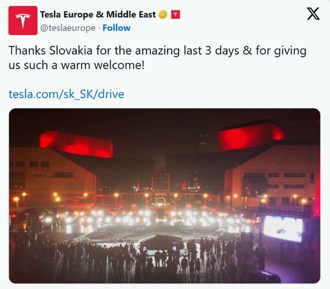 ▲斯洛伐克当地举办灯光秀已示对特斯拉的欢迎