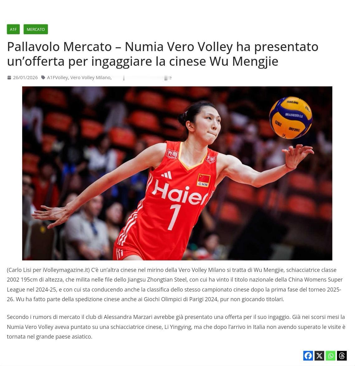 意大利权威媒体报道:米兰希望签下吴梦洁 意大利著名体育媒体《排球杂志》以“努米