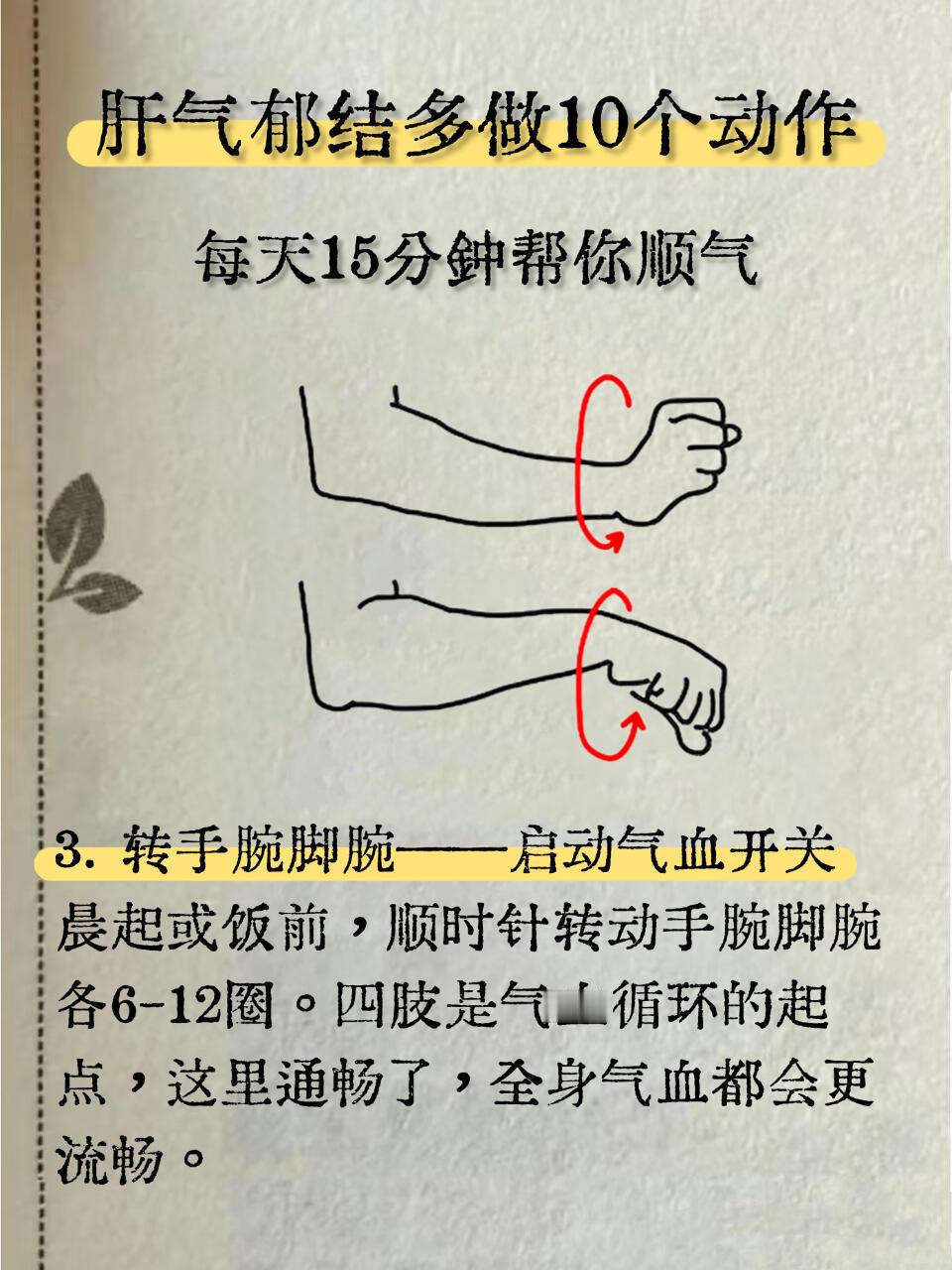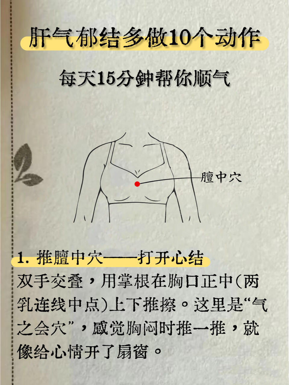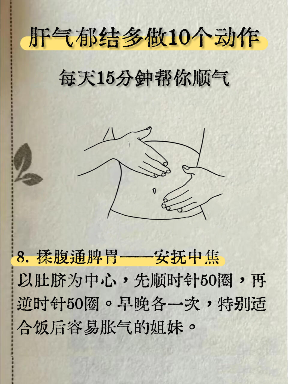 肝气郁结解药就在你体内!10个动作帮你顺气肝气郁结的表现:1. 常不自觉叹气,叹完才舒坦些2. 情绪说来就来,容易着急上火3. 生气时头晕脑胀,像有东西往头上冲4. 晚上心事重,翻来覆去睡不着5. 皮肤状态差,长斑长痘没光泽6. 月经不规律,还伴有胀痛7. 两肋、胸部总觉得胀胀的8. 喉咙像卡着东西,吞不下吐不出9. 胃口不好,一紧张就胃胀这些都是身体在悄悄提醒:肝气需要舒展了!今天分享10个轻柔动作,都是日常随手就能做的,坚持下来会发现心情和身体都轻盈不少~1. 推膻中穴——打开心结2. 搓两肋肝经——疏解郁结3. 转手腕脚腕——启动气血开关4. 晨起梳头100下——唤醒阳气5. 踮脚促循环——引气血上行6. 肩颈热敷按揉——松解淤堵点7. 黄金时段泡脚——引火归元8. 揉腹通脾胃——安抚中焦9. 推肝经泄郁火——清泻余火10. 拍八虚排淤堵——清理si角给家人的小提醒:1. 不用每天做完所有动作,选3-4个喜欢的坚持就好2. 做的时候放松心情,当你扬起嘴角,肩颈自然会放松3. 如果长期月经紊乱、持续疼痛,请尽快求助专业医师养生不是刻意的任务,而是融入生活的温柔习惯。每天留15分钟,碎片时间即可完成。你会发现:当肝气顺了,眉头自然就舒展了。国医的精诚力量微博中医药月