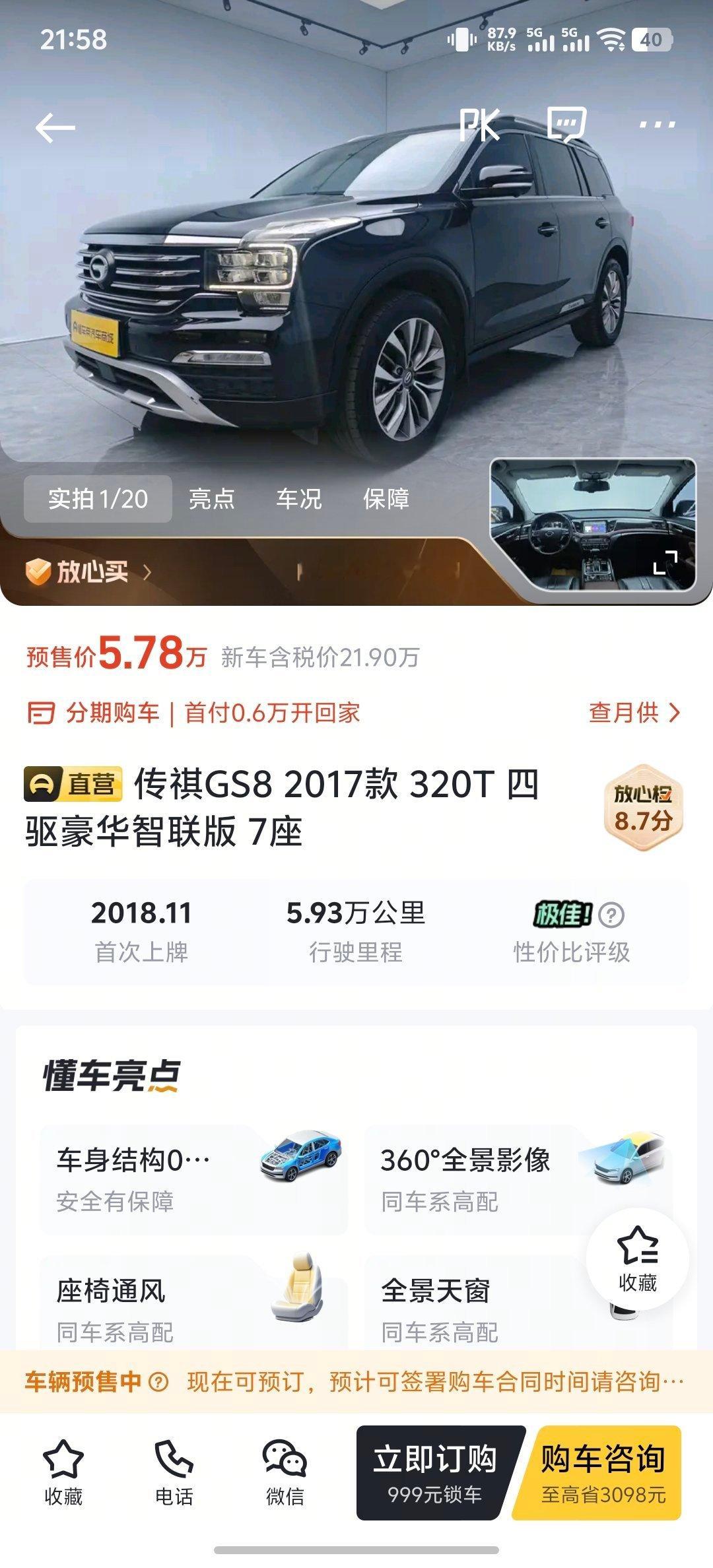 每天推荐一款二手车 传祺GS8 2017款 320T 四驱豪华智联版当7座可能有点小。但是当4/5座开还是足够大的。行驶6万公里。只要5.78万开个一两年,能赔多少啊🥲