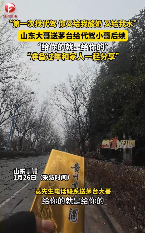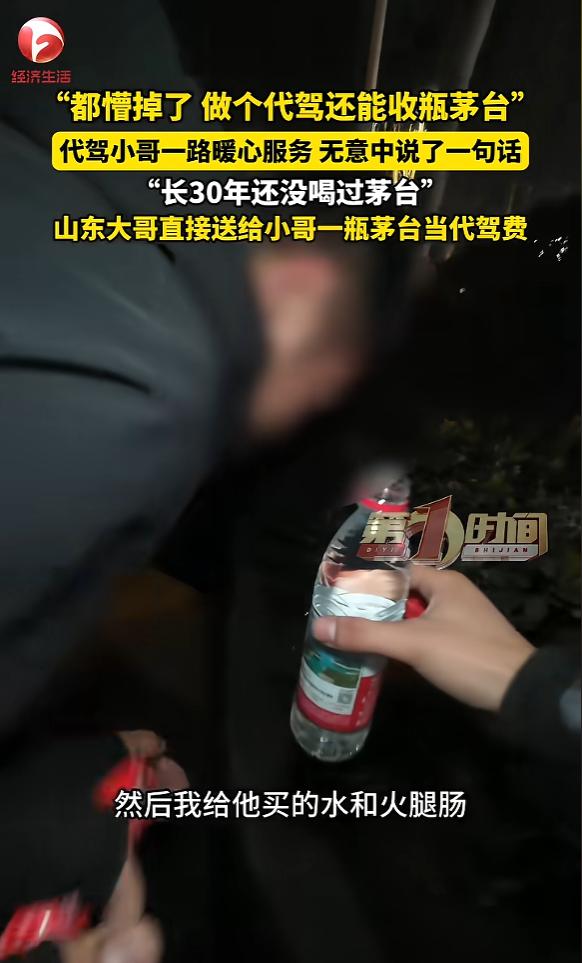 简直赚翻了!1月25日,山东聊城,一代驾小伙接单时,见车主大哥喝挺多,便照顾了一下他,没想到将大哥送到家时,他却说这代驾钱不给了,还没等小伙反应过来,大哥就直接从后备箱拿出一瓶茅台送给他,这让小伙直接懵圈。网友:这活动还有吗? 1月25日,山东聊城的一个晚上,一代驾小伙跟往常一样接单跑活,没成想这一单,让他彻底懵圈,也成了他跑代驾以来最特别的一次经历。 当晚,小伙接到订单后,很快见到了车主大哥,一见面就发现,大哥喝得不少,脸色发红,站着都有些不稳,说话也带着明显的酒气。 小伙没多想,干代驾这么久,遇到醉酒车主很常见,他只是多叮嘱了几句,让大哥坐稳扶好,一路上放慢车速,尽量让行车更平稳,怕大哥晕车难受。 途中,见大哥频频皱眉,一副想吐的模样,小伙又主动递上自己备着的酸奶,还特意停车,去路边小店给大哥买了矿泉水和火腿肠,让大哥垫垫肚子、缓一缓。 闲聊的时候,小伙无意间提起,自己活了30年,还从没喝过茅台,就是随口一说,没放在心上。 一路细心照料,总算安全把大哥送到了小区楼下,小伙正准备跟大哥说代驾费的事,没等他开口,大哥先摆了摆手,含糊着说“这代驾钱,我就不给你了”。 这话一出,小伙瞬间愣了一下,心里犯嘀咕,难道是大哥喝多了耍赖? 可没等他反应过来,大哥转身就走向车的后备箱,弯腰拿出了一瓶茅台,递到他手里,还笑着拍了拍他的肩膀。 小伙拿着手里的茅台,整个人都懵了,缓了足足一分钟才敢相信,反复确认大哥不是开玩笑,才慌慌张张收下。 后来小伙说,这一瓶茅台,差不多抵得上他大半个月的辛苦钱,当时真的又意外又感动,完全没料到,一次普通的贴心照料,能换来这么贵重的回馈。 事后,小伙心里一直不踏实,怕大哥是喝多了一时冲动,特意联系了大哥,想把茅台送回去,可被大哥一口拒绝了。 大哥说,自己是第一次找代驾,小伙又给酸奶又买水,全程细心照顾,这份心意比什么都珍贵,送茅台就是真心感谢他的贴心和负责。 这事传到网上后,很快就引发了网友热议,最火的一条评论就是“这活动还有吗?我也想去跑代驾”,调侃中满是羡慕。 其实说白了,这事根本不是什么“赚翻了”,本质就是一份善意换来了一份真诚的回馈。 代驾这份工作不容易,深夜里奔波在城市的大街小巷,拼的是辛苦,赚的是踏实钱,小伙的贴心,不是为了要什么回报,只是出于本分和善良,看到车主难受,顺手搭把手。 而车主大哥,也不是刻意摆阔,喝多了依然记着别人的好,用自己的方式,回报了这份善意。 现在很多人都说,人与人之间的关系越来越疏远,可这件小事却告诉我们,善意从来都不会被辜负。 小伙没想着投机取巧,车主没想着敷衍了事,一个真诚付出,一个懂得感恩,这样的双向奔赴,才是最动人的。 有人可能会说,一瓶茅台太贵重,但对于车主来说,这份被照顾的温暖,用什么来衡量都不过分;对于小伙来说,这份回馈,不仅是一瓶酒,更是对他工作的认可,是深夜里一份暖心的慰藉。 没有什么惊天动地的大事,就是普通人之间的一点善意和感恩,却戳中了很多人的心。 毕竟不是所有的付出都能有回报,但每一份真诚的善意,都值得被珍惜、被铭记。 对此您有什么不同的看法,可以在评论区留言讨论!!! 信息来源:《"都懵掉了做个代驾还能收瓶茅台”,代驾小哥暖心服务,山东大哥直接送给他一瓶茅台当代驾费。》AHTV第一时间