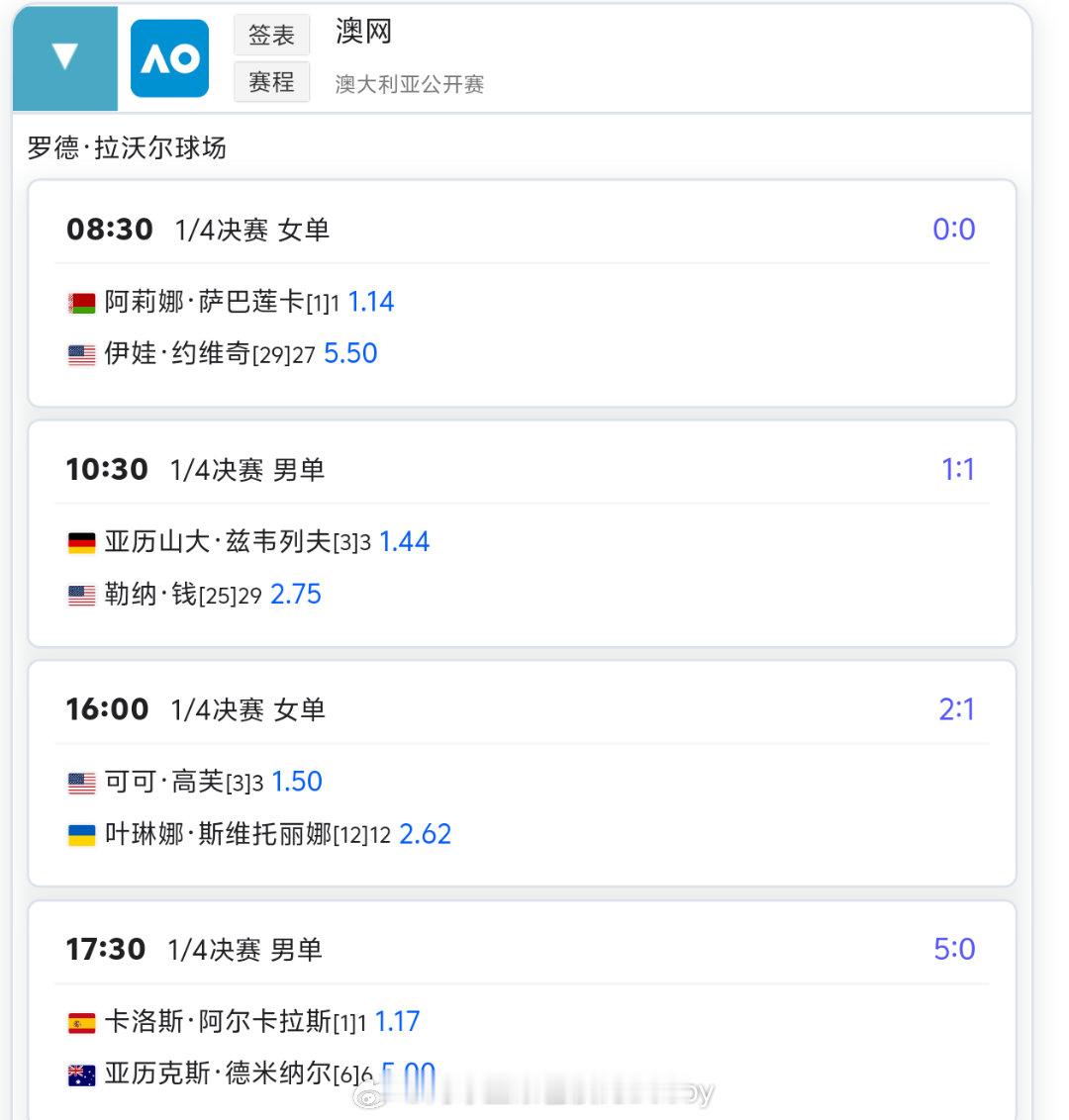 中国网球波比台bbtv 正赛第十比赛日赛程🔥🗓️ 1月27日 |🏟️ 罗德拉沃尔球场(北京时间 08:30 开赛) 🇧🇾 萨巴伦卡 vs 🇺🇸 约维奇 [29] 🇩🇪 兹维列夫 vs 🇺🇸 勒纳·钱 [25]——————————————(夜场 16:00 开始) 🇺🇸 高芙 vs 🇺🇦 烂白菜 [12] 🇪🇸 阿尔卡拉斯 vs 🇦🇺 德米纳尔 🏟️ 玛格丽特·考特球场(08:30 第一场后接)▫️ 第二场: 🇨🇳 张帅 / 🇧🇪 梅尔滕斯 vs 🇺🇸 巴普蒂斯特 / 斯特恩斯🏟️ 澳新银行球场(06:00 第一场后接)▫️ 第二场:[11] 🇨🇳 邵羽杉 vs 🇦🇺 米尔德伦🏟️ 13号球场(06:00 第一场后接)▫️ 第二场: 🇨🇳 孙心然 vs 🇦🇺 阿拉迈🏟️ 8号球场(06:00 第一场后接)▫️ 15:30 🇨🇳 渠依含 / 魏彰倩 vs 🇷🇸 奇韦特科维奇 / 🇺🇸 弗罗丁这很澳网澳网2026网球显眼包波比Bobby