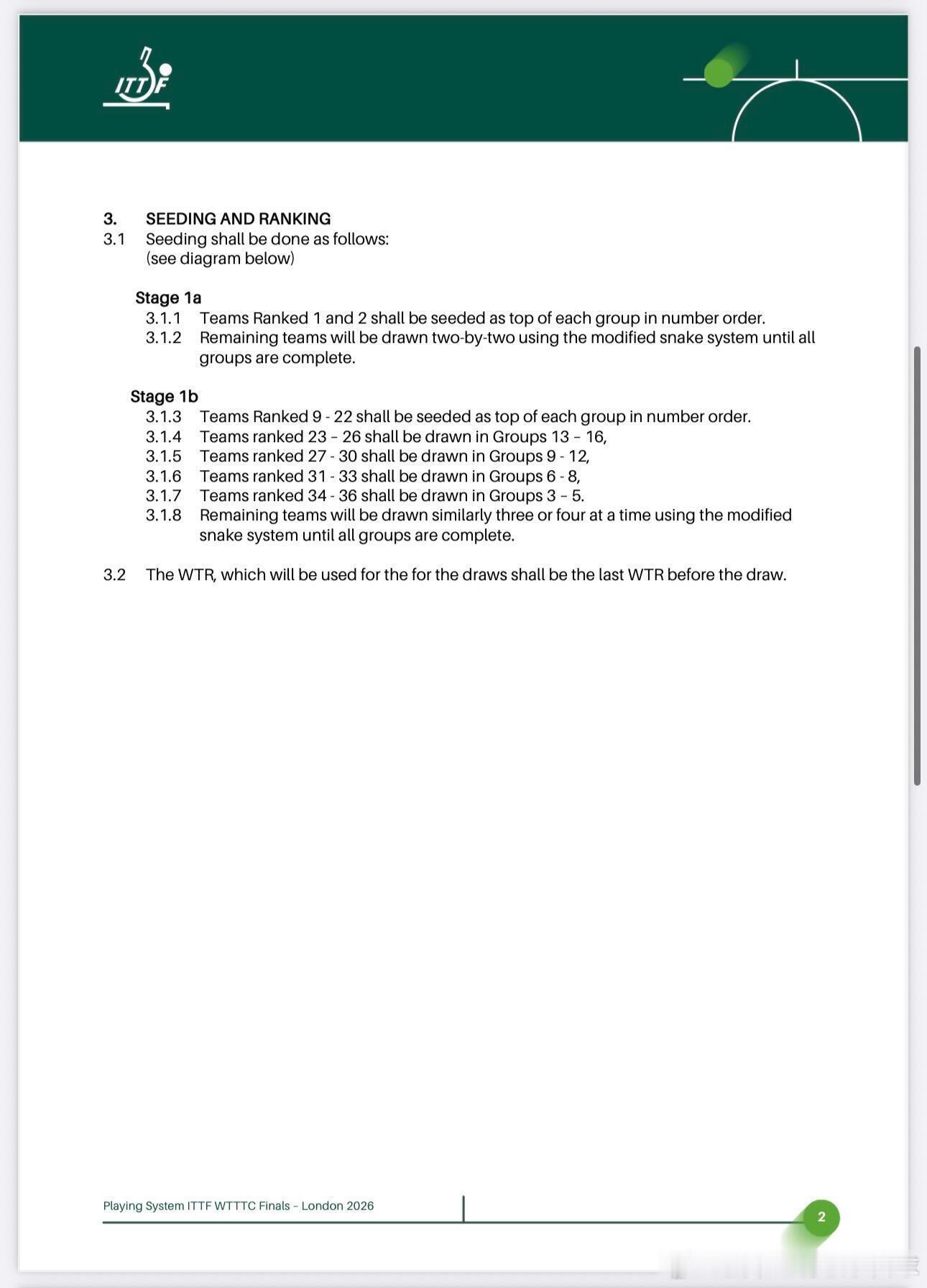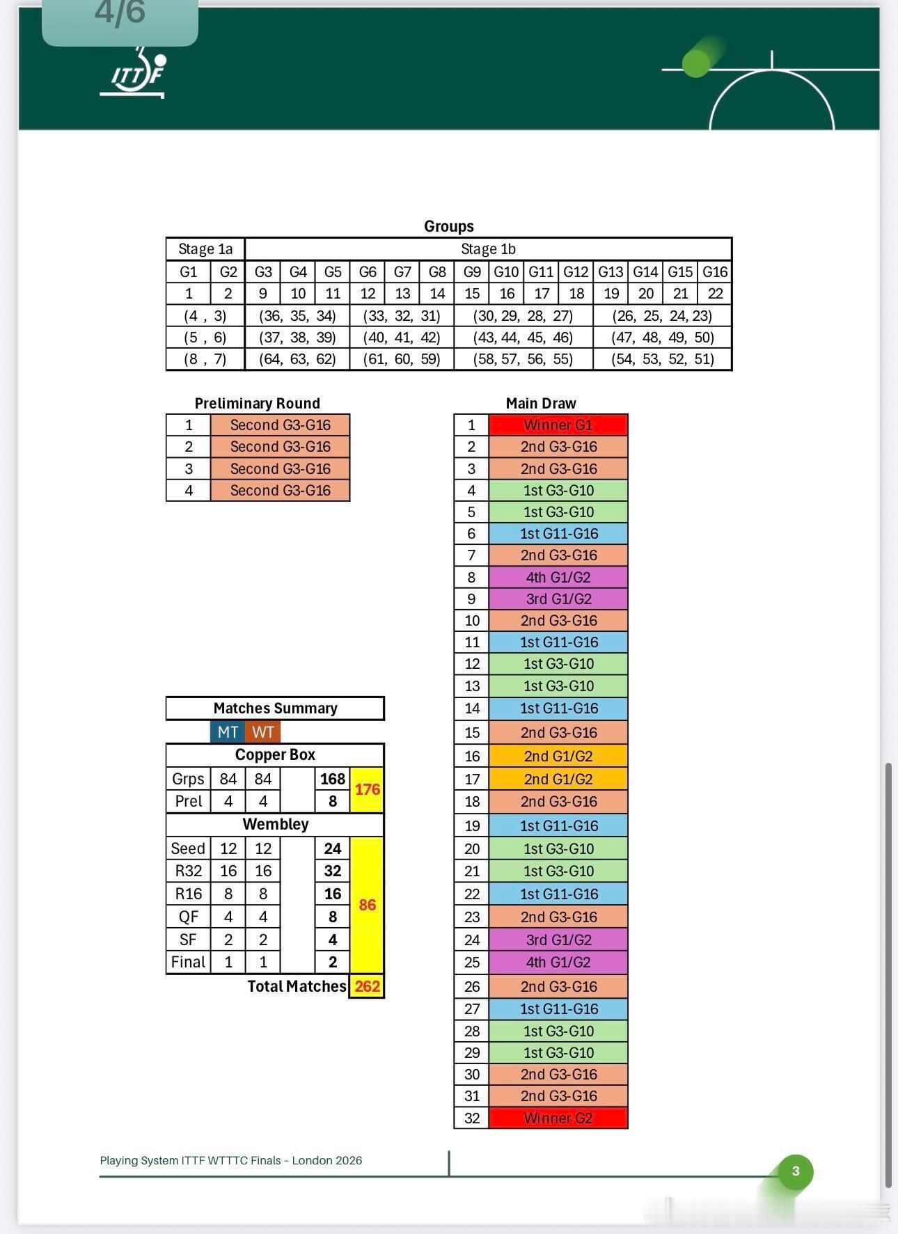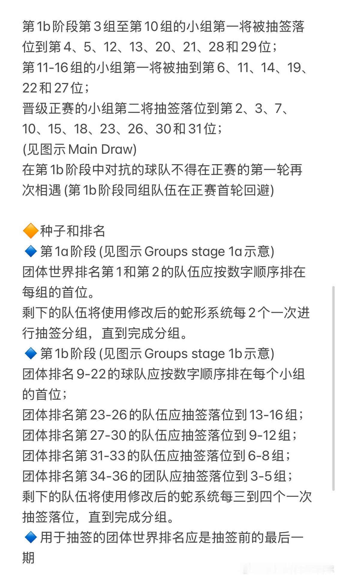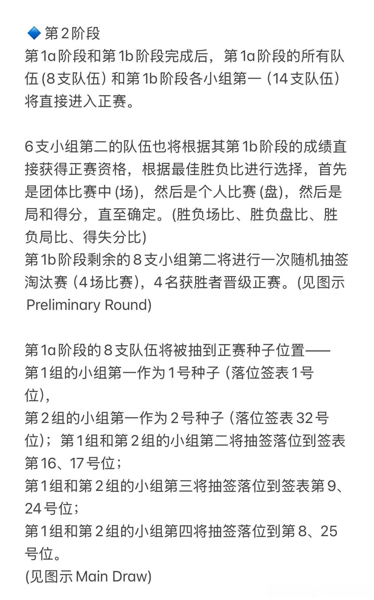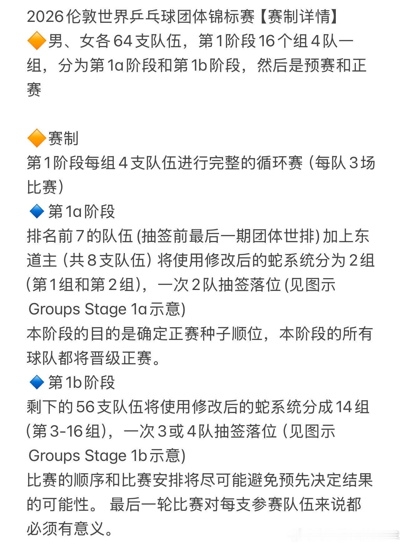 伦敦世乒赛规则眼花缭乱26伦敦世乒赛规则:男、女各64支队伍1a阶段赛前世排前7的队伍➕东道主队伍打循环赛,目的是决定淘汰赛阶段的种子位,所以这八支队伍不涉及淘汰,都直接晋级1b阶段剩下的56支队伍(世排第8到64的)抽签,一共14组,这14组进行循环赛,最后小组第一的14支队伍晋级淘汰正赛,然后14个小组第二名中成绩最好的前6支队伍同样晋级正赛,剩下的八个小组第二抽签1V1淘汰赛,获胜的四支队伍晋级,正赛的32支队伍就决出来了,分别是1a阶段的8支队伍➕14个小组第一➕6个成绩好的小组第二➕4个1v1胜出队伍正赛阶段也就是常说的淘汰赛,正常抽签比赛,上下两个半区,1a阶段的第一名1号种子,落位签表的1号位,第二名是2号种子,落位32号位,依此类推。