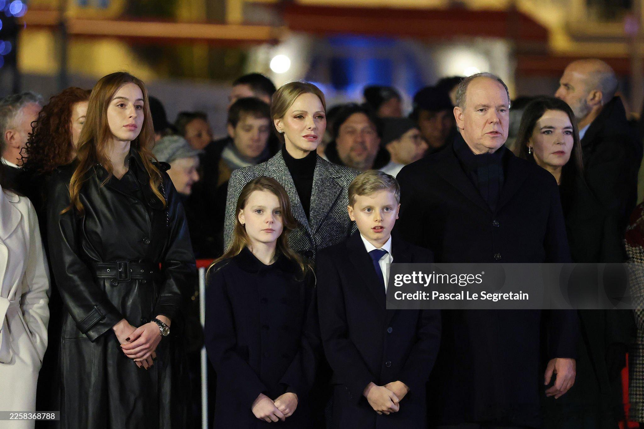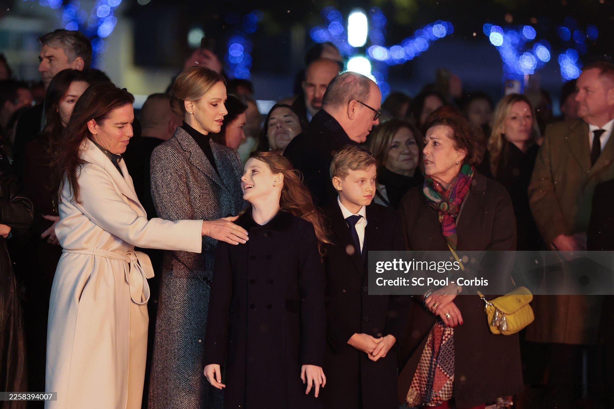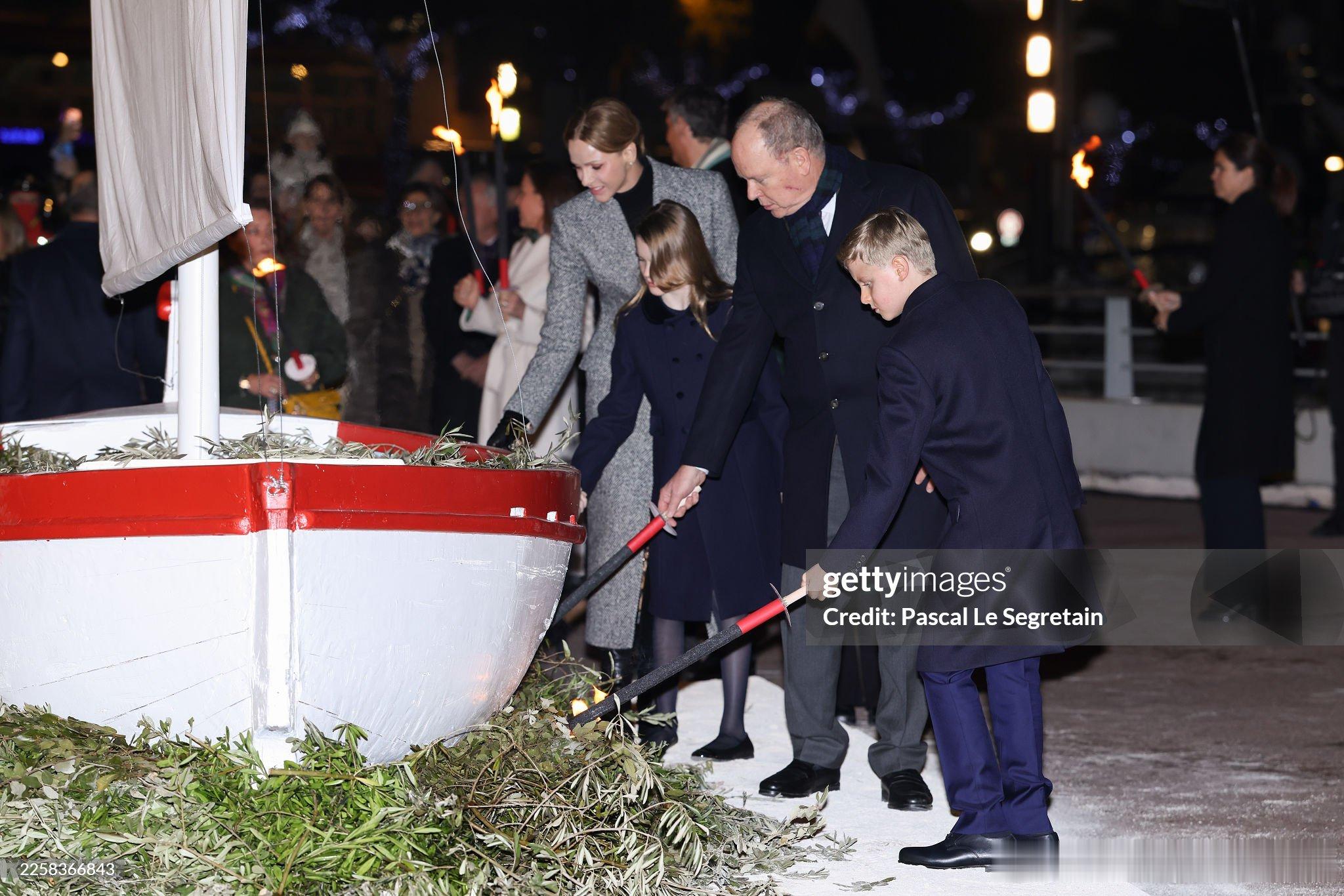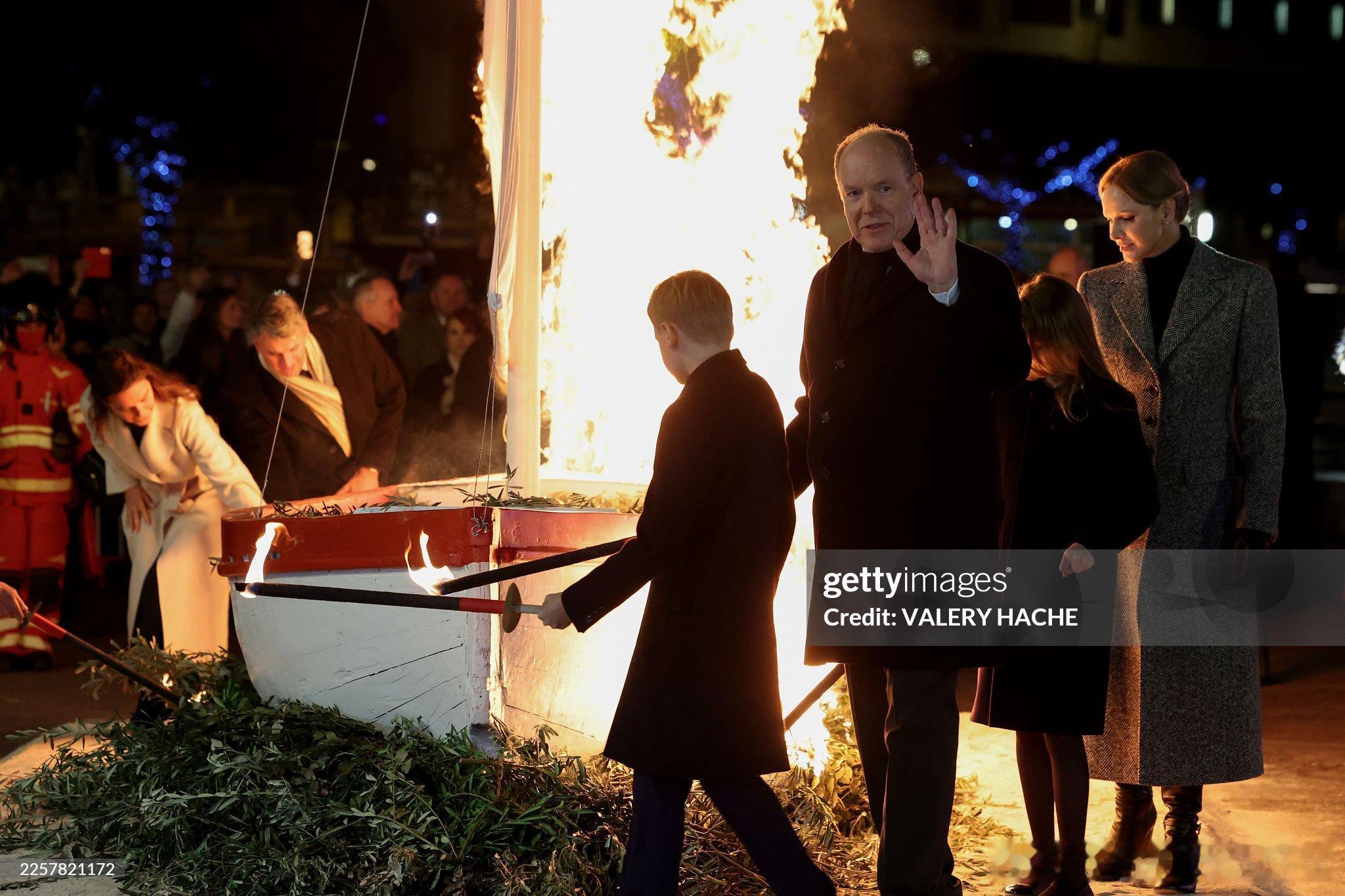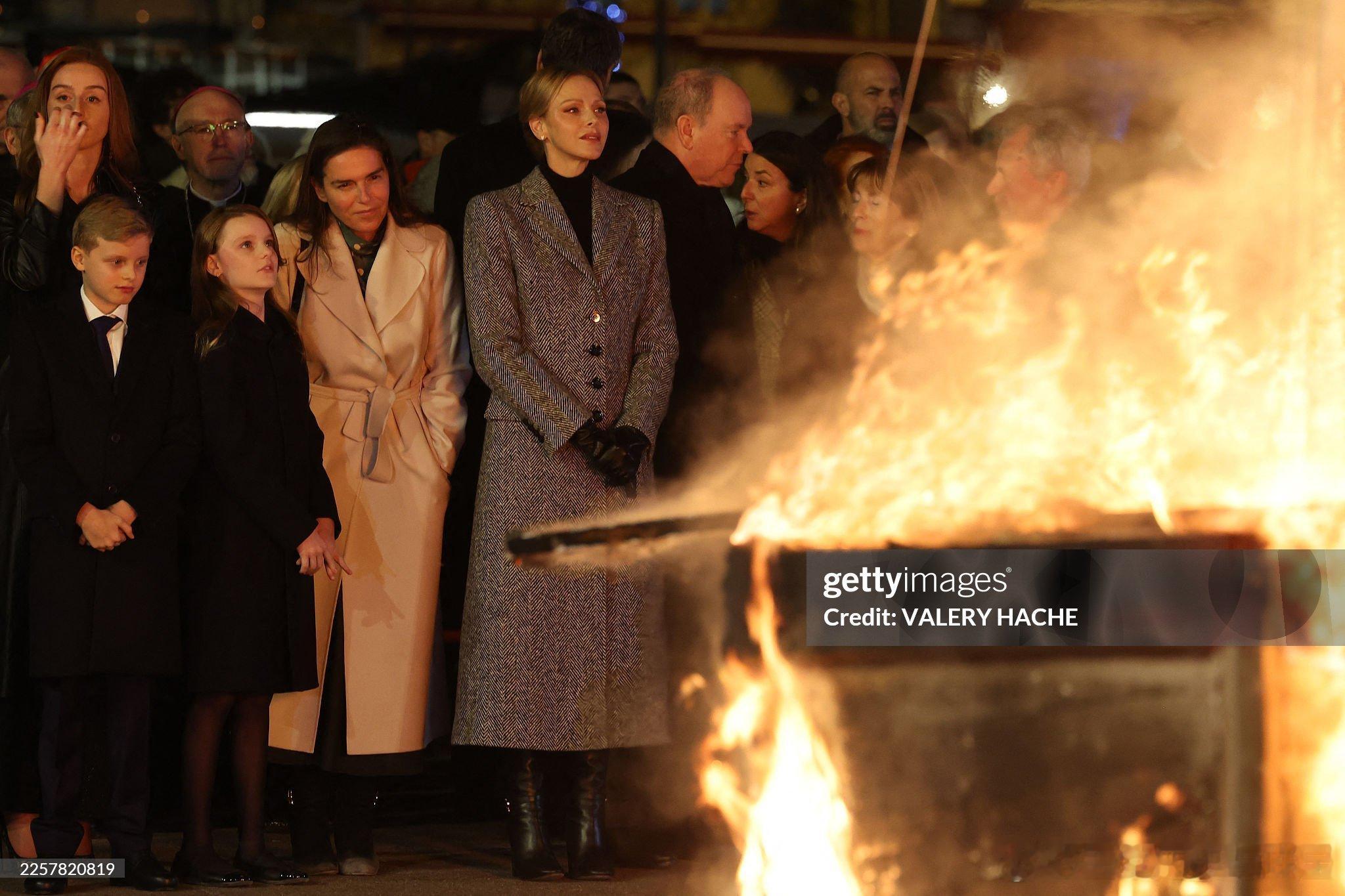 新闻 2026.1.26 摩纳哥王室成员出席一年一度的圣特沃特节(忠贞节)活动,每年烧一次船是节日的传统项目,查伦妮的灰色大衣来自Dolce&Gabbana。