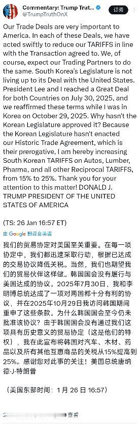 突发新闻:特朗普指控韩国未遵守贸易协议,关税提高到25%。 特朗普今天(北京时间1月27日)发文写道:“我们的贸易协定对美国至关重要。在每一项协定中,我们都迅速采取行动,根据已达成的交易协议降低关税。当然,我们也期望我们的贸易伙伴这样做。韩国国会没有履行与美国达成的协议。2025年7月30日,我和李在明总统达成了一项对两国都十分有利的协议,并在2025年10月29日我访问韩国期间重申了这些条款。为什么韩国国会至今仍未批准该协议?由于韩国国会没有通过我们这项具有历史意义的贸易协定(这是他们的特权),我在此宣布将韩国对汽车,木材,药品以及所有其他互惠商品的关税从15%提高到25%。” 这10个百分点的涨幅,足以让韩国对美出口商感到肉疼。 这次波及的范围相当广,汽车行业首当其冲,要知道汽车可是韩国出口美国的支柱产业,这利润空间一下子就被压缩了一大截。 除了汽车,木材和药品这些原本互惠的商品也没能幸免,统统都被纳入了这次加征关税的名单里。 特朗普这招“先礼后兵”玩得很溜,先把协议签了,把姿态摆低了,等你这边迟迟不动,他再直接掀桌子。 他这逻辑很清晰,我们的贸易协定对美国至关重要,既然你们不守规矩,那我就要用关税手段来维护美国的利益。 这对韩国来说,无疑是个巨大的打击,本来指望靠着美韩贸易协定赚点钱,现在倒好,成本直接上去了。 那些依赖美国市场的韩国企业,现在估计都在开会研究对策,看看是涨价把成本转嫁给消费者,还是自己咬牙吞下这部分损失。 韩国国会那边现在的压力肯定小不了,本来可能还在犹豫或者拖延,现在被特朗普这么一逼,到了不得不表态的时候。 如果不批准,那25%的高关税就会一直悬在头顶,这对韩国经济的冲击可不是闹着玩的。 要是批准吧,又好像是被美国拿捏住了,显得韩国在国际谈判桌上没什么底气。 特朗普这次把事情闹得这么大,也是在给其他贸易伙伴敲山震虎,别以为跟他签了协议就能高枕无忧,落实不到位照样挨打。 这也符合他一贯的行事风格,做生意嘛,讲究的就是个互惠互利,你要是只想占便宜不出力,那这生意就没法做。 现在韩国最头疼的,恐怕还不是这关税本身,而是如何在一个强势的美国总统面前,既保住面子又保住里子。 毕竟,25%的关税摆在那里,每一分钱都是真金白银的损失,谁也赔不起这笔账。 接下来的日子,就看韩国方面怎么接招了,是赶紧把协议批下来安抚特朗普,还是硬着头皮跟美国对着干。 无论哪种选择,这次特朗普的关税大棒,都已经实实在在地砸在了韩国经济的痛点上。