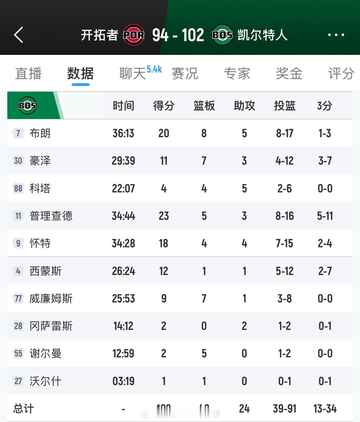 五人上双!凯尔特人102-94战胜开拓者🔥杰伦-布朗20分8篮板,普里查德23分5篮板,怀特18分,豪瑟11分,A西蒙斯12分,阿威9分7篮板。