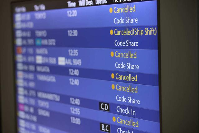 当地时间2026年1月26日,日本北海道,新千岁机场的航班状态屏幕显示航班取消。视觉中国图