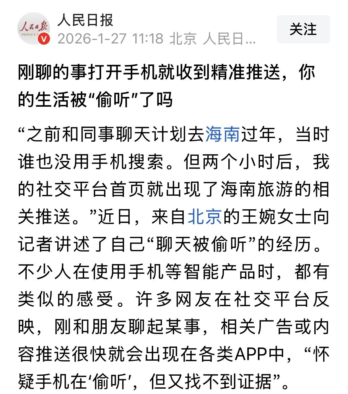 北京,女子前脚刚和同事说完要去海南过年,后脚手机上就出现了海南旅游的推送,她怀疑自己的聊天内容被手机偷听了,在网上一发,有相同经历的人还不少。对此,一专家说出实情,不禁让人脊背发凉…… 王婉女士最近遇上件怪事。事情说大不大,说小也不小。 前阵子,她在办公室跟同事闲唠嗑,俩人合计着过年去海南过年,避开北京的寒潮。 当时也就是随口一说,连手机都没掏出来搜一下,更没在任何APP上打字。 结果呢?俩小时不到,王婉打开手机刷社交软件,好家伙,首页第一条就是海南旅游的攻略,紧接着又是几条三亚酒店的打折广告。 当时她汗毛都竖起来了!王婉后来回忆起这事,还是一脸的不可思议, 她不禁怀疑,这手机是不是装了窃听器?它是不是一直在偷听人说话? 这事儿不光王婉遇上过,很多人估计都有这种细思极恐的时刻。 你刚跟朋友念叨想买双跑步鞋,转头购物APP就给你推了同款。 你在饭桌上说最近掉头发严重,没过多久生发水的广告就弹窗了。 大家都在网上吐槽,说感觉手机比我妈还了解我,但我又抓不到它偷听的实锤。 也有人说把手机麦克风关了就好了。 那这到底是巧合,还是真的被监控了? 为了搞清楚这里面的门道,记者专门找了懂行的人。 这位老专家一听这事,就科普了,说现在已经不是关不关麦克风的事了,现在的套路比那深多了! 以前咱们以为手机偷听是打开了麦克风录音,其实现在的APP精得很,它们玩的是拼图游戏。 啥叫拼图?就是它不光听你说啥,它还看你在哪、看你干啥。 比如,你在短视频平台上看了几条露营的视频,看得挺起劲,停留时间还挺长。APP立马就给你打个标签:这人喜欢户外。 紧接着,因为很多APP都是一家公司的,这数据就内部共享了。 你在这边看了露营,那边的新闻APP就觉得你可能也想看户外装备,甚至通过你手机的定位,发现你最近常去公园,就直接给你推周边的露营基地广告。 而且,现在的人工智能那是真厉害,简直是读心术大师。 专家解释,以前要分析一个人的喜好,得人工去看去听,成本太高。现在有了生成式AI,那是秒级处理。 哪怕你只是随口说了一句话,AI能在零点几秒内把语音转成文字,把里面的关键词,比如“海南”、“过年”、“穷游”…瞬间提取出来,然后精准匹配广告库。 技术是好技术,但用在这就让人心里发毛。专家也承认,现在的数据挖掘能力太强了,强到让人觉得没秘密。 那咱们就没治了吗?其实,工信部专门出过《APP收集使用个人信息最小必要评估规范》,明令禁止APP乱伸手。 比如你一个修图软件,凭啥要我的通讯录权限?你一个手电筒APP,凭啥要录音权限? 规定是有了,但执行起来总有漏洞。 王婉的遭遇就是个例子。她也知道可以去关权限,但现在的APP贼得很,你不给权限它就不让你用,或者给你个极简版,啥功能都没有。 为了能正常聊天、正常办公,大家只能捏着鼻子把各种权限都点了允许。 直白点说,这就是个便利和隐私的交易。我们想用免费的APP,就得拿数据去换。商家想精准赚钱,就得拼命挖数据。 只是现在的天平有点倾斜,挖得太狠了,连咱们闲聊的私密空间都给挖穿了。 专家最后也提醒,这事儿光靠用户躲是躲不掉的,得靠监管的大棒子真砸下来,让那些违规收集数据的企业真疼,咱们的手机才能真正安静下来。 说实话,王婉这遭遇搁谁身上都得心里发毛。聊个天就被精准推送,感觉跟被装了监控似的,毫无隐私可言。 但专家把话挑明了,现在根本不需要偷听麦克风,大数据比你自己都懂你。 你看啥视频、在哪停留、跟谁互动,甚至打字习惯,这些碎片拼起来就是你的数字画像。 再加上AI技术,零点几秒就能把语音关键词抠出来。 最气人的是,明明有规定不让乱要权限,可APP要么不给权限不让用,要么偷偷收集。 大家为了用个软件,只能认了。 虽然找不到偷听的实锤,但这种被算法算计的感觉,真是让人没有安全感。 监管是有,可漏洞跟筛子似的。只能自己多留个心眼,少在手机前聊私事。但说句实在的,在大数据面前,谁还不是个透明人呢?这事真挺让人憋屈的。 对此,你怎么看? 关注@运良说法