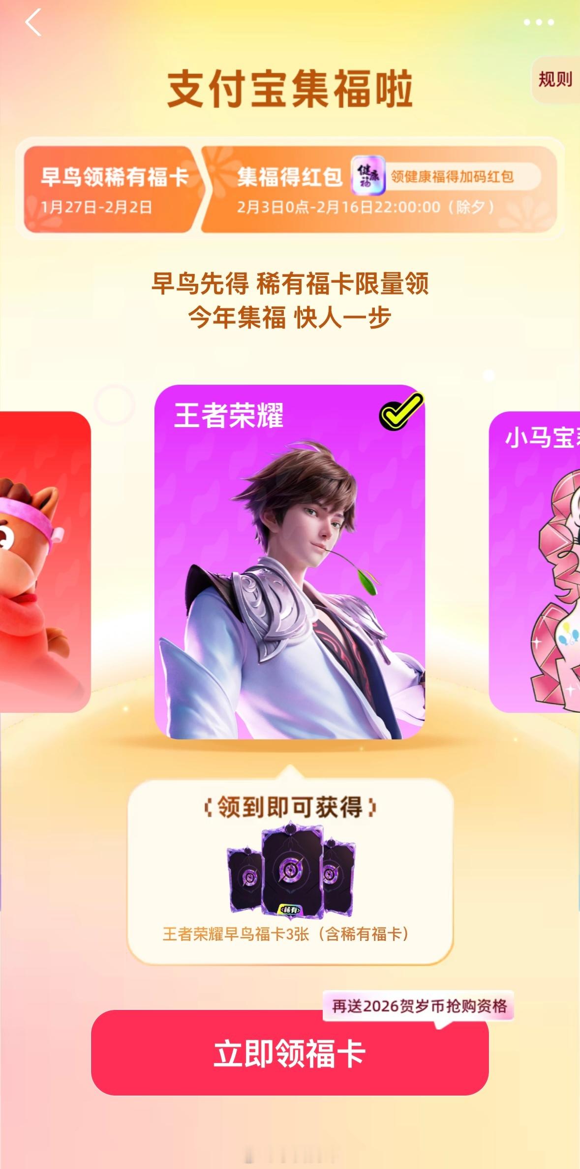 支付宝集福支付宝集福这就开始了看了下现在是早鸟福卡活动,有不同IP发放合计300