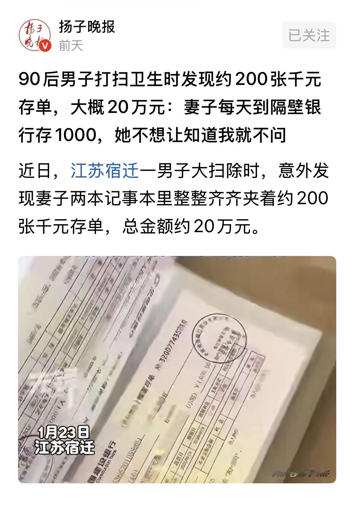 江苏宿迁,男子在家大扫除,竟意外发现妻子的笔记本里夹着200张千元存单,男子一数,总共20万!他这才知道,妻子每天借上厕所为由,背着他把俩人做生意赚来的现金存进隔壁银行,防止钱拿在手上乱花。面对这笔“私房钱”,男子一句话让全网羡慕:这才是过日子的高人! 故事的主角是一对90后的小夫妻,俩人都是做小买卖的个体户,日子过得不算大富大贵,但也热气腾腾。 前两天,苏先生在家里大扫除,想着把犄角旮旯都清理一遍。 翻着翻着,他翻出了妻子平时记账用的两本旧记事本。 这本子看着普通,平时也就是记个买菜钱、水电费啥的。 结果苏先生随手一抖落,竟从本子里稀里哗啦掉出来一大堆纸片子。 捡起来一看,苏先生眼珠子都快瞪出来了,全是银行存单! 一张一张的,夹得整整齐齐,每张面值都是1000块。 他耐着性子数了数,足足有200来张,加起来得有20万块钱! 这钱哪来的?苏先生脑子里瞬间打了个问号。家里的钱都是俩人一起管,平时也没见媳妇大手大脚花钱,咋突然冒出这么一笔私房钱? 原来,这钱是媳妇从去年8月份开始,一点一点抠出来的。 大家都知道,做小买卖的人,手里过的都是现钱,每天收摊了结算,兜里都是现金票子。 在苏先生的妻子看来,钱放在手里,看着啥都想买,不知不觉就花超了。她寻思着,得给家里留条后路,也得攒点家底。 于是,一个看似荒诞却又极其自律的计划开始了。 妻子每天借着上厕所的由头,溜达到店铺隔壁的银行存钱。 她每天存1000块,雷打不动。存完拿了单子,回来夹在记事本里,神不知鬼不觉。 就这样,她坚持了大半年。 苏先生看着这一堆存单,心情很微妙。 换做一般人,第一反应可能是:好啊你个败家媳妇,敢背着我藏钱?是不是防着我? 甚至觉得自己被欺骗了,信任感崩塌。 但苏先生心态极好,他看着这些存单,又看了看正在忙碌的媳妇,心里没什么火气,反而涌上来一股说不出的感动和佩服。 他没吵没闹,也没像审犯人一样逼问。苏先生说了一句特别爷们儿、特别通透的话:她不想让我知道,那我就不问。 这话说得,简直是教科书级别的高情商! 苏先生很清楚,这不是媳妇藏的私房钱,这是给家里攒家底呢。 她怕自己管不住手,怕老公赚钱辛苦,想用这种最笨的办法,给这个小家攒出一份安全感。 如果自己非要打破砂锅问到底,非要争个所以然,那不仅伤了媳妇的心,还把这份心意和爱意给践踏了。 他觉得,夫妻之间,有时候不需要那么清清楚楚、明明白白。你的苦心我懂,我的信任你也要接得住。 现在的结局特别暖心。这20万块钱,苏先生一分没动,依然让媳妇保管。 他说了,这钱既然是她辛辛苦苦攒下来的,那就还归她管,以后家里有大事,这笔钱就是底气。 这事儿传到网上,评论区也是很有意思。 有网友酸溜溜地说:我也想扫地扫出20万,可惜我家扫地只能扫出头发和灰尘! 还有人羡慕他,说这媳妇太会过日子了,自律性太强了,我要是有这毅力,早就发财了。 但更多的人是在夸苏先生,说这老公格局太大了!多少夫妻因为钱吵架?因为藏私房钱闹离婚?人家这一句话,把事儿办得漂漂亮亮,既保全了媳妇的面子,又维护了夫妻感情。 确实,在现在的婚姻里,信任比金子还贵。很多时候,我们太执着于透明度,觉得夫妻之间不能有秘密。 但苏先生这事儿告诉我们,有些秘密是善意的,是出于爱和责任。 你可以想象一下那个画面:媳妇每天假装上厕所,其实是去银行存钱,心里既紧张又有点小得意。 老公发现后,假装不知道,心里却在偷着乐。这种默契,这种心照不宣的温柔,比那20万现金值钱多了。 生活就是这样,不需要惊天动地的浪漫。就是在你累的时候有人递杯水,在你想偷懒的时候有人推你一把,在你犯傻藏钱的时候,有人笑着看破不说破。 好的婚姻,不是互相盯着对方的缺点,而是互相成全对方的好意。哪怕是藏在厕所里的20万,只要心里装着这个家,那就是最踏实的幸福。 普通人过日子,不也就图个这种知冷知热、互相兜底的伴儿吗? 也有人说,就算另一半真的偷偷存私房钱,也不必立刻上升到背叛或不爱的高度。这通常是一个心理需求和安全感的问题,而不仅仅是金钱问题,偷偷存私房钱,往往是婚姻中财务自由度不足的一种反弹。 与其纠结对方有没有藏钱,不如关注对方为什么需要这笔钱。给彼此留一点空间和体面,往往比彻底的透明更能留住人心! 对此,你怎么看? 关注@运良说法
