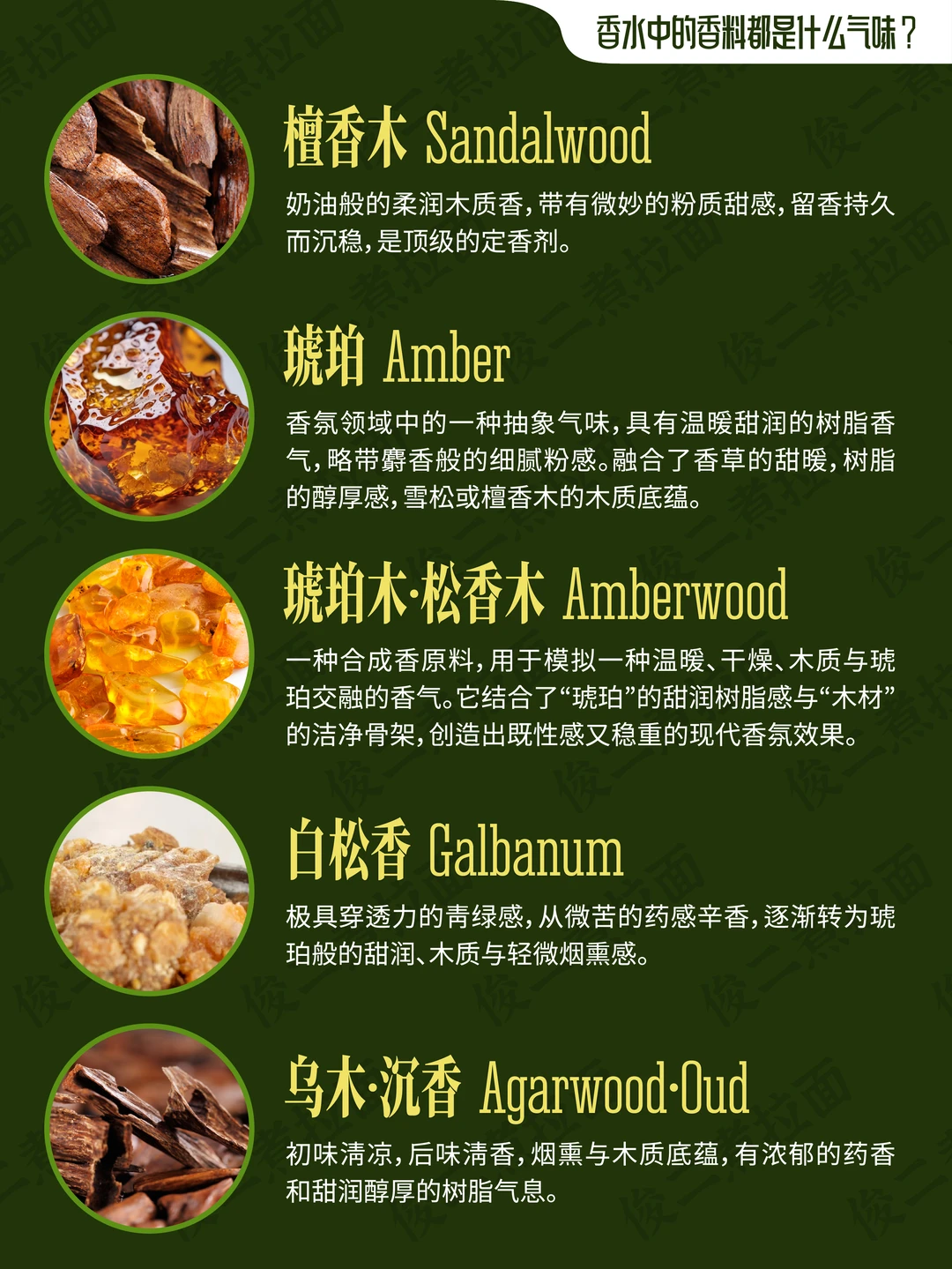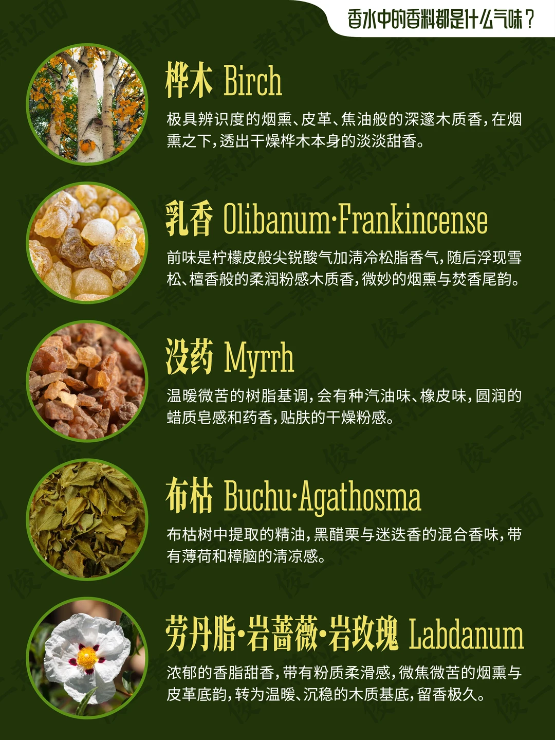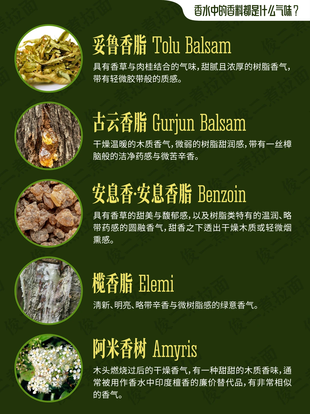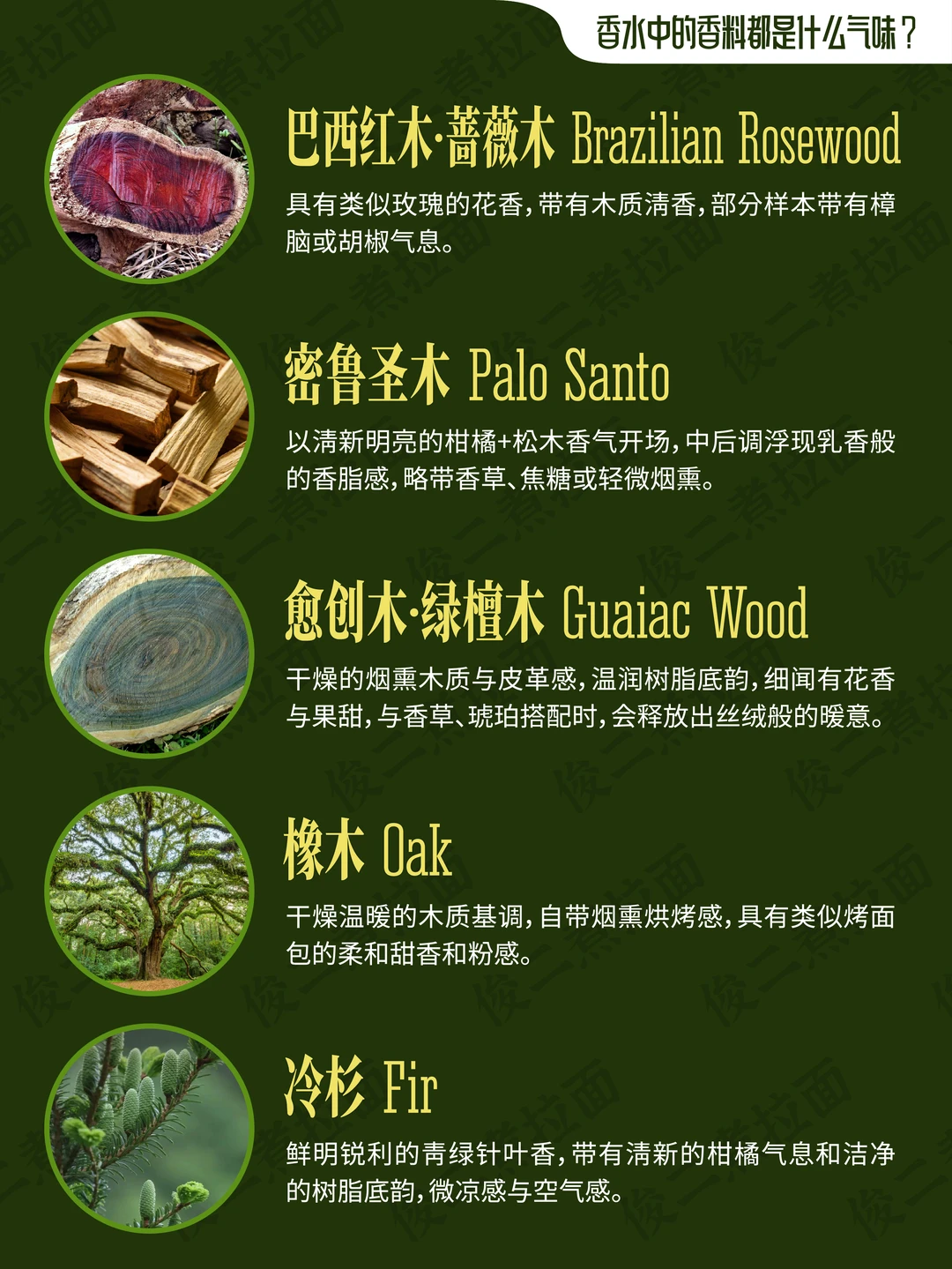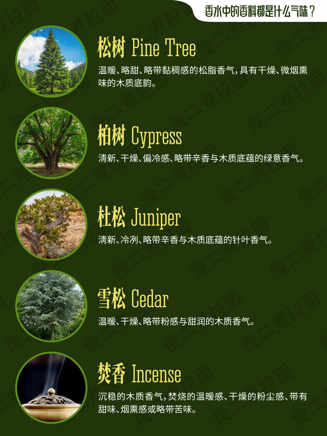 柠檬树 山苍树·木姜子 无花果树 橄榄树 焚香 松树 柏树 杜松 雪松 白松香 檀香木 琥珀 琥珀木·松香木 乌木·沉香 巴西红木 绿檀木 愈创木 橡木 冷杉 梨树 桦木 妥鲁香脂 安息香·安息香脂 古云香脂 榄香脂 阿米香树花 劳丹脂·岩蔷薇·岩玫瑰 乳香 没药 布枯 浮木·海心浮木 克什米尔木·开司米酮 亚基戛纳木·阿奇加拉木 梦木 千龙木