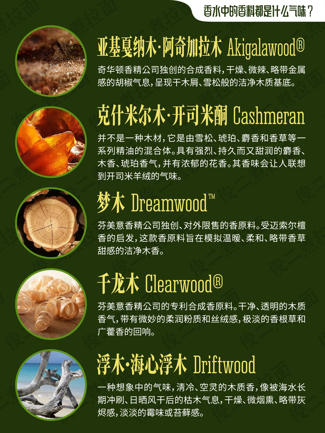 Lemon Tree,Litsea Cubeba,Fig Tree,Olive Tree,Incense,Pine Tree,Cypress,Juniper,Cedar,Galbanum,Sandalwood,Amber,Amberwood,Agarwood·Oud,Brazilian Rosewood,Palo Santo,Guaiac Wood,Oak,Fir,Pear Tree,Birch,Tolu Balsam,Benzoin,Gurjun Balsam,Elemi,Amyris,Labdanum,Olibanum·Frankincense,Myrrh,Buchu·Agathosma,Driftwood,Cashmeran,Akigalawood®,Dreamwood™,Clearwood®