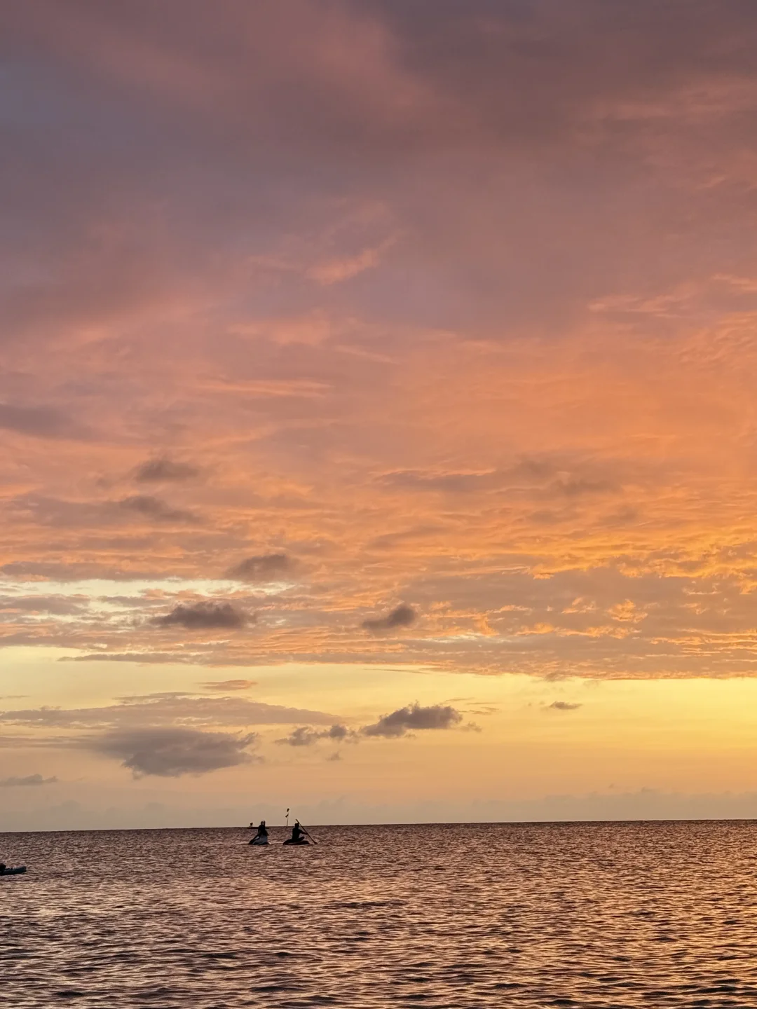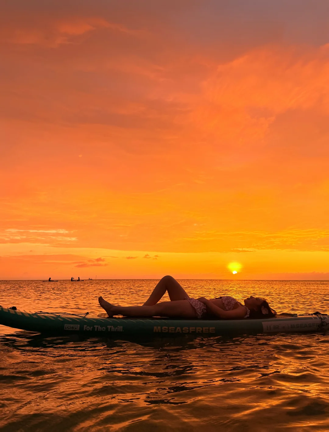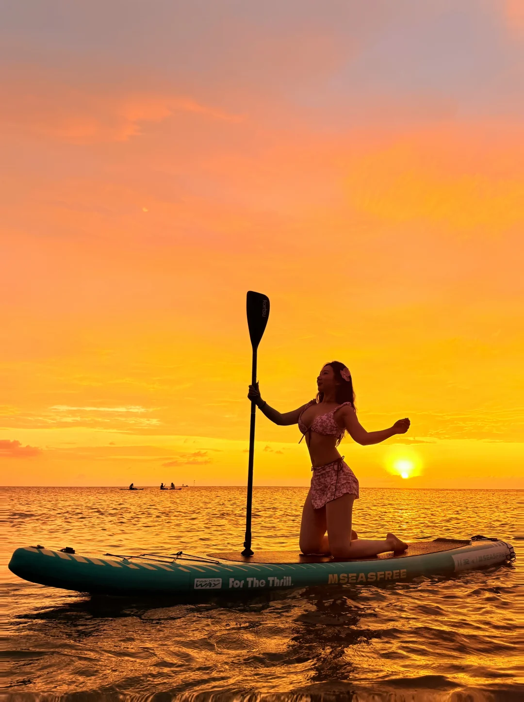 去之前开始下小雨,但也看到了超绝日落 桨板40马币/人,不要被坑了 最好看的时间很短[完啦R]要抓紧拍拍拍 一起去的姐妹可以早点过去互相拍,视角高度相同会比小哥在水里拍出来的更好看‼️ 只能拍到身形,最展示健身结果的时候到了💢 -