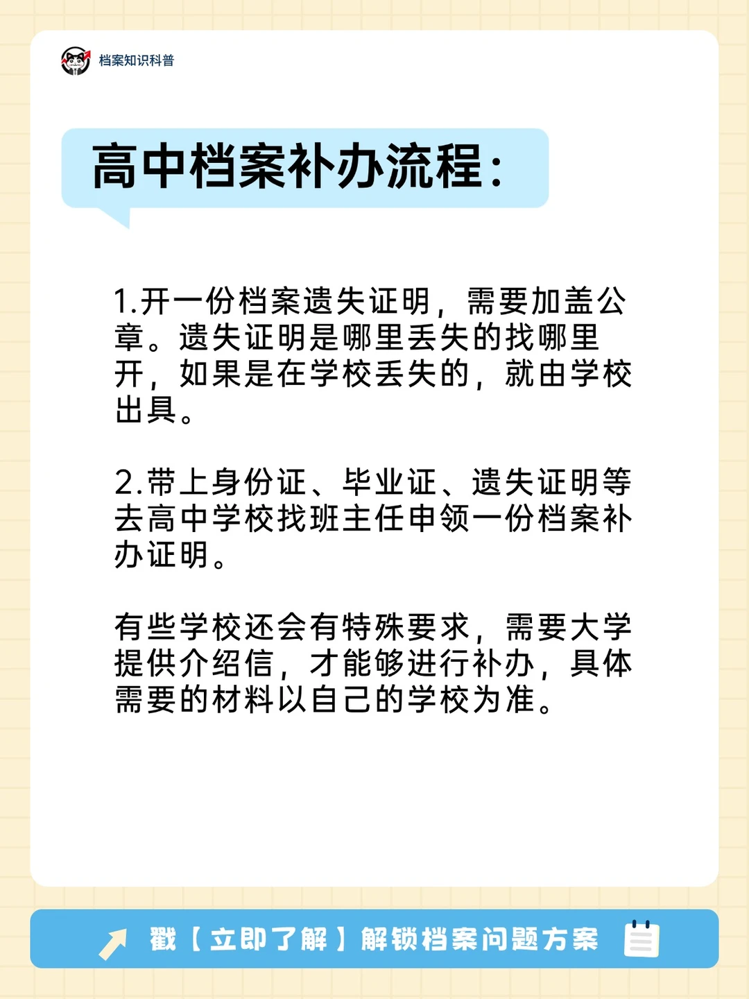 高中档案被大学弄丢了怎么办?别怕,全网最全高中档案补办流程来了! 高中档案补办流程: 1、开一份档案遗失证明,需要加盖公章。遗失证明是哪里丢失的找哪里开,如果是在学校丢失的,就由学校出具。 2、带上身份证、毕业证、遗失证明等去高中学校找班主任申领一份档案补办证明。有些学校还会有特殊要求,需要大学提供介绍信,才能够进行补办,具体需要的材料以自己的学校为准。 3.再将相关材料交给学校审核,确认无误后签字盖章 4.按照学校补办档案的流程开始补高中档案材料,一般补办的是毕业生登记表等材料 5.档案材料补好后要盖章,再密封装袋 6.高中档案补办完成后提交给大学辅导员,让老师帮忙放进大学档案袋中