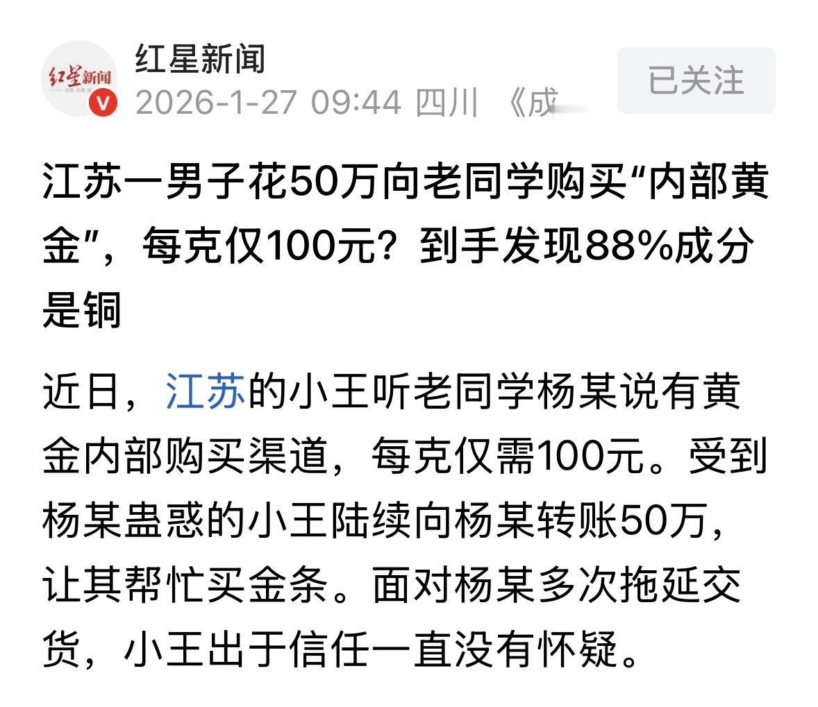 “悲剧了!”江苏,一男子听老同学说,他有黄金内部购买渠道,每克才100元,他开心坏了,直接给老同学转了50万,想买“内部黄金”,转手一倒卖,就发大财了,可万万没想到,黄金到手后,他发现88%成分是铜。男子彻底傻眼了。 王先生是个上班族,可工资月月光,一年下来攒不下几个钱,他无时无刻不琢磨着,怎么发笔横财,过上富足的日子。 这天,许久没联系的老同学杨某突然找上了他,这一找,就像一颗石子投入了王先生那本就不平静的心湖,泛起了层层贪婪的涟漪。 杨某神秘兮兮地对王先生说,他有个黄金内部购买渠道,每克才100元,这可比市面上便宜太多了,转手一卖,那利润可不得了! 王先生一听,眼睛瞬间亮了起来,仿佛看到了无数钞票在向自己飞来。 他的心跳开始加速,心里盘算着:要是把家里的积蓄都拿出来,买上50万的,按照市面价格一倒手,那得赚多少啊! 这简直就是天上掉馅饼的好事,自己终于要走上人生巅峰了。 王先生越想越激动,根本没多想这里面的猫腻,直接就给杨某转了50万,满心欢喜地等着杨某把金条送来。 杨某收到钱后,却开始找各种理由拖延交货。一开始,王先生心里虽然有点着急,但一想到是老同学,而且对方说的内部渠道可能确实比较麻烦,也就选择了相信。 他自我安慰,老同学不会骗自己的,再等等,好饭不怕晚。 日子一天天过去,王先生每天都在盼星星盼月亮,就盼着杨某能把金条送到自己手上。 元旦刚过,杨某终于传来好消息,说部分金条到货了。 王先生兴奋得差点跳起来,他顾不上其他,立刻马不停蹄地赶到张家港去取货。 当他拿到那3根金条时,双手都微微颤抖着,感觉自己马上就要成为有钱人了。 然而,当他仔细观察这几根金条时,心里渐渐涌起了一丝不安。 这金条的颜色看起来不太对劲,没有正常黄金那种耀眼的光泽,而且敲起来声音沉闷,不像黄金那样清脆。 王先生的脸色变得煞白,一种不祥的预感涌上心头。他赶紧找了个地方对金条进行鉴定。 结果,如同一道晴天霹雳,让他彻底傻眼了,这3根金条竟然是假冒产品,里面88%的成分是铜! 王先生只觉得天旋地转,差点晕过去。他怎么也没想到,自己一心想着发大财,却被老同学给骗了。 他后悔不已,不停地责怪自己咋这么贪心啊,这么便宜的事情怎么可能轮到我头上呢?要是当初多留个心眼,仔细想想,也不至于落到现在这个地步。” 幸运的是,警方很快介入调查,杨某承认因为自己资金周转困难,网购了假金条来行骗。 目前,杨某因涉嫌诈骗被采取了刑事强制措施,王先生那近50万的被骗款也全部追了回来。 经过这次教训,王先生深刻地明白了“贪小便宜吃大亏”的道理。 他意识到,在这个世界上,没有不劳而获的好事,那些看似诱人的“便宜”背后,往往隐藏着巨大的陷阱。 千万不能被一时的贪念冲昏头脑,否则,就像他一样,不仅没发成财,还差点血本无归,给自己带来了痛苦和烦恼。 对此,你怎么看? 关注@运良说法