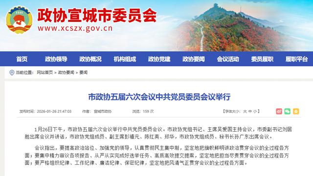 据宣城市政协消息:1月26日下午,市政协五届六次会议举行中共党员委员会议。市政协党组书记、主席吴爱国主持会议,市委副书记刘居胜出席会议并讲话,市政协党组成员、副主席彭禧元、陈红英、郑华,市政协党组成员、秘书长孙广东出席会议。