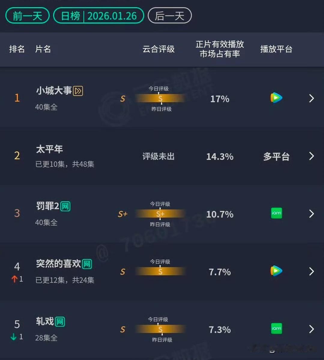 1月28日,赵丽颖《小城大事》云合破17%,评级却还是S,我有点看不懂云合算法了