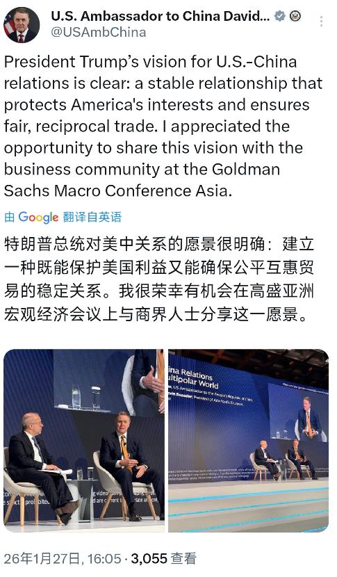 美国驻华大使庞德伟今天(1月27日)写道:“特朗普总统对美中关系的愿景很明确:建立一种既能保护美国利益又能确保公平互惠贸易的稳定关系。我很荣幸有机会在高盛亚洲宏观经济会议上与商界人士分享这一愿景。” 特朗普所谓“保护美国利益”的说法,不是第一次出现了。他第二任期上台后就把贸易政策和国家安全绑定,反复强调“美国优先”,甚至把关税当成了常用工具。 2025年2月,美方就以芬太尼问题为由对中国输美产品加征关税,紧接着把税率一路抬到145%,中方很快跟进反制,关税战直接波及电动车、芯片这些关键领域。 更别提美方还把50多家中国高科技企业塞进“实体清单”,连AI大模型、超级计算机相关的公司都没放过。这些动作哪里是在求“稳定”,分明是在破坏既有的贸易秩序。 庞德伟选择在高盛亚洲宏观经济会议上说这些,针对性很明显。参会的都是商界人士,而高盛自己2025年在中资发行人海外股票融资里占了21.7%的份额,主导了宁德时代、小米这些企业的增发项目,显然对中国市场兴趣浓厚。 他想让商界相信特朗普的“稳定关系”承诺,但现实是之前的关税战已经让美国市场吃了苦头。 2025年4月那波关税加征后,美股半个月蒸发4万亿美元,美国消费者看着家电、食品杂货全涨价,只能靠“囤货”应对。这些商界人士都是亲历者,不会只听几句愿景就忽略实际损失。 特朗普口中的“公平互惠”,得看站在谁的角度定义。美国一直盯着对华贸易逆差,但2024年中美双边货物贸易额都超过6800亿美元了,中国是美国第三大出口目的地,美国也是中国第一大货物出口市场,这种依存关系根本不是单方面“让利”。 而且2025年日内瓦会谈后,双方取消了91%的加征关税,暂停了24%的高税率,这说明之前的对抗模式根本走不通,连美方自己都得让步。 现在又提“保护美国利益”,本质还是想按自己的规则重塑贸易关系,但全球产业链早把两国绑在一起了,真要彻底割裂,美国制造业和消费者第一个受影响。 更关键的是,特朗普这套政策在美国国内都没得到多少支持。2025年10月的民调显示,大多数美国选民觉得他的政策加剧了中美紧张,中国问题上的支持率是所有外交议题里最低的。 超过半数的美国民众明确反对对中国商品征收更高关税,连近四分之一的共和党人都不赞成他2025年的对华政策。民众心里门儿清,所谓“保护利益”最后买单的是自己的钱包,这种情况下,“稳定关系”的愿景很难落地成实际政策。 庞德伟自己的行动也和这套“稳定”表述有点矛盾。就在上个月,他还在北京召集Quad国家大使开小会,搞排他性的“小圈子”,中方早就明确反对这种做法。 一边说要稳定贸易关系,一边在地区安全上搞对抗,商界人士看在眼里,自然会对所谓“愿景”打个问号。 高盛那些人天天跟中资企业打交道,肯定清楚中国市场的分量,也知道单边制裁和关税战对谁都没好处。 海关总署刚公布的数据能说明问题,2025年中国对美进出口4.01万亿元,中美经贸本质就是互利共赢。 特朗普想靠关税和实体清单“保护利益”,但2025年美国GDP增速被高盛从2.4%下调到1.7%,非农就业也没达标,这些经济压力逼着他不得不回到谈判桌。日内瓦和斯德哥尔摩的会谈成果已经证明,只有坐下来协商才能解决问题,光喊“保护美国利益”的口号没用。 其一,特朗普的“愿景”里,“美国利益”永远是第一位的,所谓“公平互惠”更像是要求中国单方面妥协的说法。 从2018年第一次贸易战到2025年的芯片管制升级,美方的操作从来都是“我要占便宜”,而不是“我们一起获利”。把16nm以下芯片的海外流片都限制了,把37家中国企业塞进“强迫劳动清单”,这些做法哪里有“互惠”的影子。 其二,稳定的贸易关系不是靠单方面宣布就能实现的。2025年双方反复拉锯的关税调整已经说明,任何对抗措施都会引发反制,最后伤害的是两国企业和消费者。 高盛之所以敢在中资IPO上砸重金,就是因为看到了中国市场的潜力和全球资金的真实需求,这些市场力量不会因为政治口号就改变方向。 庞德伟在会上讲这些,更多是想给美国商界吃颗定心丸,让他们觉得特朗普政府还有“理性”的一面。但现实的矛盾摆得很清楚:特朗普的“保护主义”和中美贸易的相互依存根本拧不到一起。 美国要想真正获益,就得放弃那些单边制裁和关税大棒,回到多边贸易规则的框架里来。毕竟2025年的会谈成果已经证明,双方各让一步才能实现真正的“稳定”,光靠喊愿景解决不了芯片、农产品这些实际分歧。 说到底,商界关心的是实实在在的合作机会,不是政治层面的漂亮话。高盛主导的那些中资企业融资项目,还有国际长线资金对中国消费、科技企业的兴趣,都说明市场需要的是开放和稳定,而不是对抗和限制。