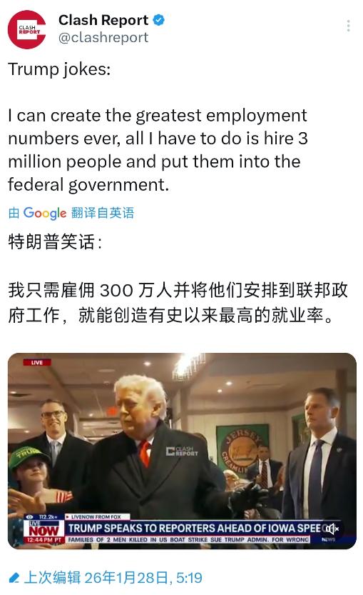 特朗普今日笑话:“我只需雇佣300万人并将他们安排到联邦政府工作,就能创造有史以来最高的就业率。” 先看人数本身有多离谱。美国国会预算办公室有明确统计,联邦政府目前总共才约300万名雇员。这意味着特朗普要把现有规模直接翻倍,可现实里联邦政府根本装不下这么多人。 除邮政部门外,当前联邦公务员约230万,这些人里有大量从事退伍军人医疗保健、农业检查这类必需工作的人员,并非存在300万的岗位空缺。 历史数据更能说明问题,美国联邦政府从1787年建国到1985年,经过两次世界大战和罗斯福新政的扩张,内阁部才从最初的几个增至13个,独立机构从20多个增至67个,两百多年都没到300万总规模,现在要凭空加300万,完全脱离实际。 财政压力会直接压垮这个想法。马斯克牵头的政府效率部正忙着裁员凑1万亿美元节省开支,这笔钱还只占联邦总支出的15%。 新增300万雇员意味着要额外承担巨额薪酬和福利,按照美国就业成本指数的统计标准,这包括工资、奖金、保险等多项支出。 现有联邦雇员的收入本就高于社会平均水平,新增300万人的年度开支保守估计也要数千亿美元,这对于正推行紧缩预算的特朗普政府来说,显然是根本无法承担的负担。 就业率的算法也根本不是这么回事。美国就业率统计靠一套“4+1”监测体系,既要算住户调查里的就业人口比例,也要看机构调查的非农就业数据,还得结合职位空缺和失业救济金申请情况综合判断。 联邦政府雇员仅占全美非农就业岗位总数的1.5%,就算真加300万,对整体就业市场的拉动作用也极其有限。 更关键的是,美国就业增长主要靠私营部门驱动,医疗保健、休闲酒店业都是核心动力,政府岗位激增反而可能挤占私营企业的劳动力资源,导致企业用工成本上升,最终影响整体就业质量。 特朗普自己的实际行动也在打这句话的脸。他上任后没多久就责成马斯克牵头政府效率部推动裁员,还签署行政令规定每4人离职最多招1人。 截至2025年3月,已有超过10万名联邦雇员通过“买断”或解雇离开岗位,占总人数的4.5%,白宫的目标更是裁员5%至10%。他自己都在忙着精简政府规模,说要新增300万雇员,完全是前后矛盾的说法。 这些岗位的合理性更经不起推敲。联邦政府裁员都要靠“手术刀”式精准操作,生怕裁掉关键岗位人员,说明现有编制已经是根据职能需求设定的。新增300万人找不到对应的实际工作,最终只会导致机构臃肿、效率低下。 历史上联邦政府每一次机构扩张都伴随职能增加,比如增设农业部对应农业发展需求,成立联邦储备委员会调控金融,现在没有任何新职能支撑300万岗位的必要性,所谓“创造就业”不过是虚假的数字游戏。 还要考虑法律和工会的约束。大量联邦工作人员加入了工会,任何人员变动都必须遵循集体谈判协议,非工会成员也受联邦法律的工作保障条款保护。 之前特朗普政府的“买断”计划就被联邦法官两次推迟,连精简人员都阻力重重,更别说大规模新增雇员,这类操作在法律层面根本行不通。 美国劳工统计局的多项数据都能戳破这个谎言。非农就业指数每月更新,它清晰显示政府部门从来不是就业增长的主力。 2025年2月联邦政府还减少了1万个工作岗位,抑制了公共部门的增长势头。就业趋势指数更能说明问题,它包含8个维度的指标,没有任何一项显示增加政府雇员能推动指数大幅上升。 特朗普竞选时曾承诺靠重振制造业、降低企业税新增2500万个岗位,这说明他清楚真正的就业增长要靠私营经济。 现在抛出“300万联邦岗位”的说法,本质上是对就业逻辑的刻意曲解。经济学家早就指出,大规模政府裁员都会影响私营部门就业,反过来新增大量冗余政府岗位,只会让财政负担转嫁到企业和纳税人身上,最终拖累整体经济和就业市场。 说到底,这个说法既不符合美国联邦政府的实际规模,也无视财政承受能力,更违背了就业率的科学统计逻辑,连特朗普自己的政策行动都与之相悖。它根本不是什么就业方案,更像是一句脱离现实的随口调侃。