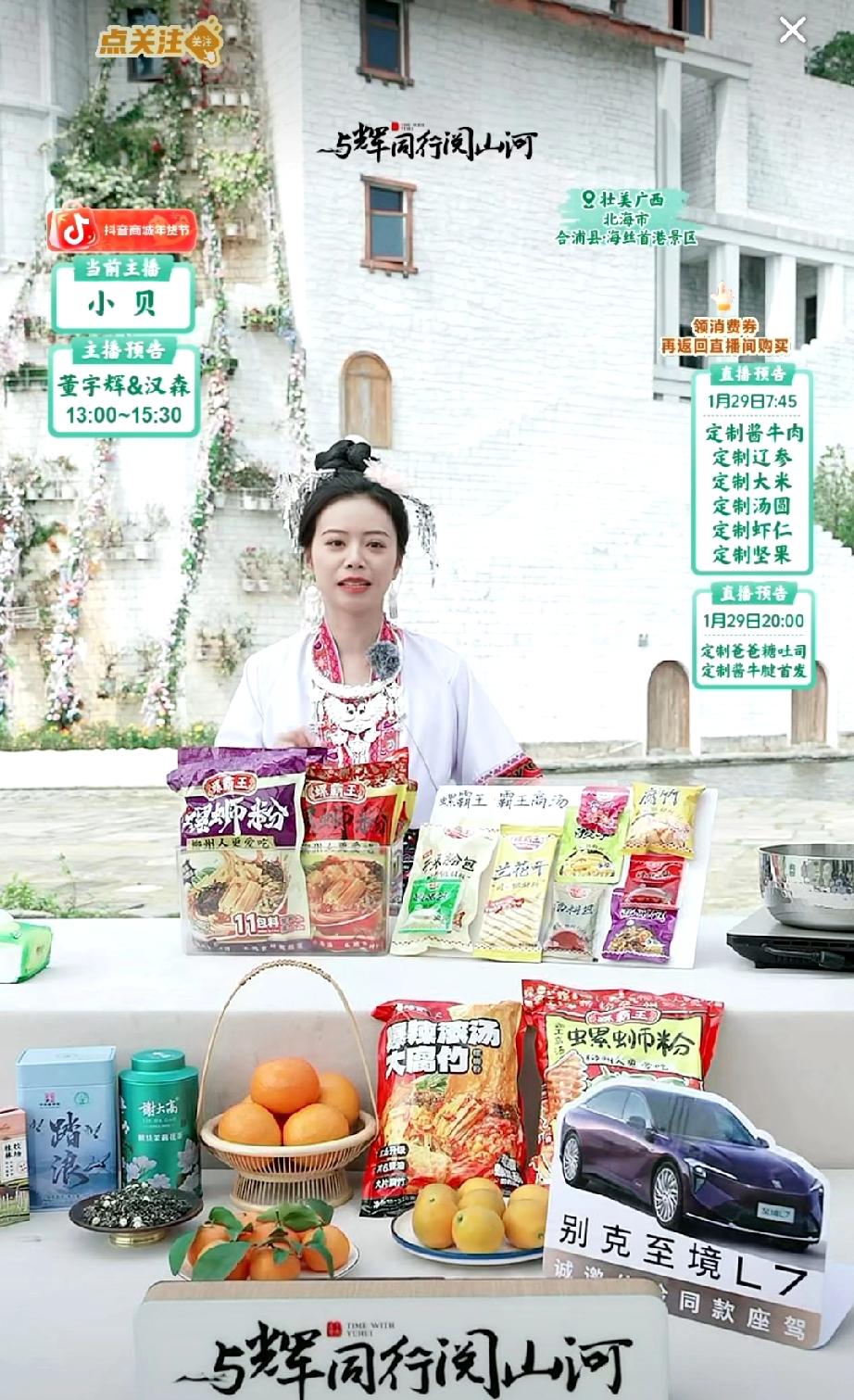 惊艳!小贝真是多才多艺的女孩子,什么样的舞蹈都能跳的那么好看! 经过两天布置的现场背景也同样惊艳到大家。董宇辉花费那么多精力去打造这个背景花墙,也是为了带给朋友们视觉上的美观。董宇辉真的是在各方各面都在努力的做到更好。相信他的这份努力和付也一定不会被辜负的。 在小贝的优美舞蹈中在北海市合浦县海思首港景区开启了广西行的第一场直播。一开播就有9万多朋友涌入。小贝开播就给大家带来了广西特产螺蛳粉,这下喜欢吃螺蛳粉的朋友们有福啦。 董宇辉 与辉同行