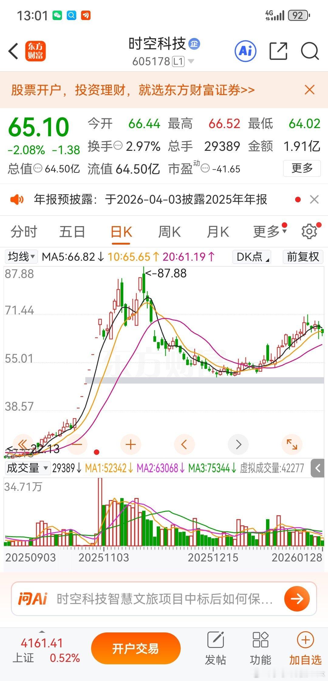 时空科技,本次持股到此结束时空科技,历经一个多月的持股,今天在65-66元区间建