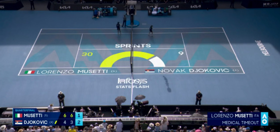比赛第三盘,穆塞蒂1-2落后申请医疗暂停时,转播放给出了一项数据:穆塞蒂比赛中冲刺跑多达30次,德约科维奇为9次。