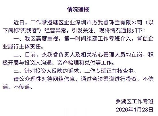 1月28日,深圳市罗湖区工作专班发布情况通报。近日,工作掌握辖区企业深圳市杰我睿珠宝有限公司(以下简称“杰我睿”)经营异常,引发关注。