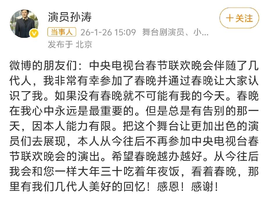 春晚“钉子户”孙涛正式发文告别春晚 孙涛表示是春晚成就了他,但是现在因为个人