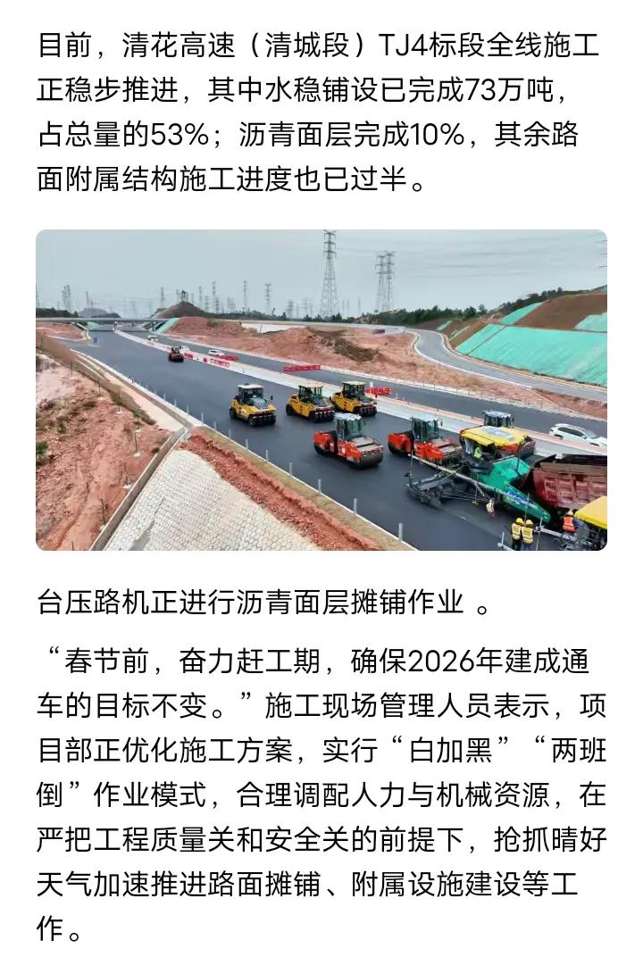 年内通车,清远至广州花都的清花高速(双向八车道)为2026年内确保通车的项目,清花高速建成后广州和东莞等地开车来往连州还有湖南永州和邵阳等地将更加顺畅,目前已经开始大面积铺设水稳层和路面沥青,全长约1.4公里的北江四塔特大桥正在冲刺合龙,美林服务区也即将开始内外装修,太平收费站主体结构已经完成,清花高速未来将通过清花北延线和永州江华至连州直达湖南,届时广州和清远等地开车来往连州和永州等地将更加便捷,春节期间车流量大的时候可以为许广高速和S1广连高速至少分担20%车流量。