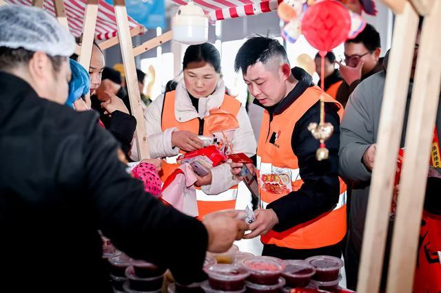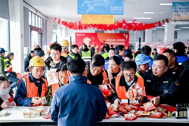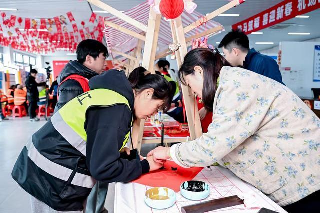办证大厅内,祝桥镇带来的文艺演出将活动推向高潮。伴随着一曲曲喜庆欢快的歌曲,建设者们聚拢在办证大厅内,或驻足欣赏节目,或在“迎新春年货节”摊位前,亲手编织中国结、提笔书写福字,品尝腊八粥、汤圆、饺子、非遗糖画等富有年味的小吃,参与互动游戏兑换干货、坚果、米面油等年货。沉浸式的新春体验,让这群城市建设的主力军在异乡也能感受家的温暖。“我刚刚手把手教了一位建设者写毛笔字,看着她从一开始不会握笔到最后写出‘福’字,内心特别有成就感。”作为一名书画爱好者,机场建设指挥部职工高燕当天早早就来到现场,铺开纸墨义务为大家书写春联和福字。“虽然今年过年不能回家陪陪家人,但在这里感受到了满满的关怀。”来自淮安的建设者姜阳手捧刚领到的年货向记者说道,“等过完年,我想领着老婆孩子来到上海,一起乘飞机出去旅行,好好聚一聚。”