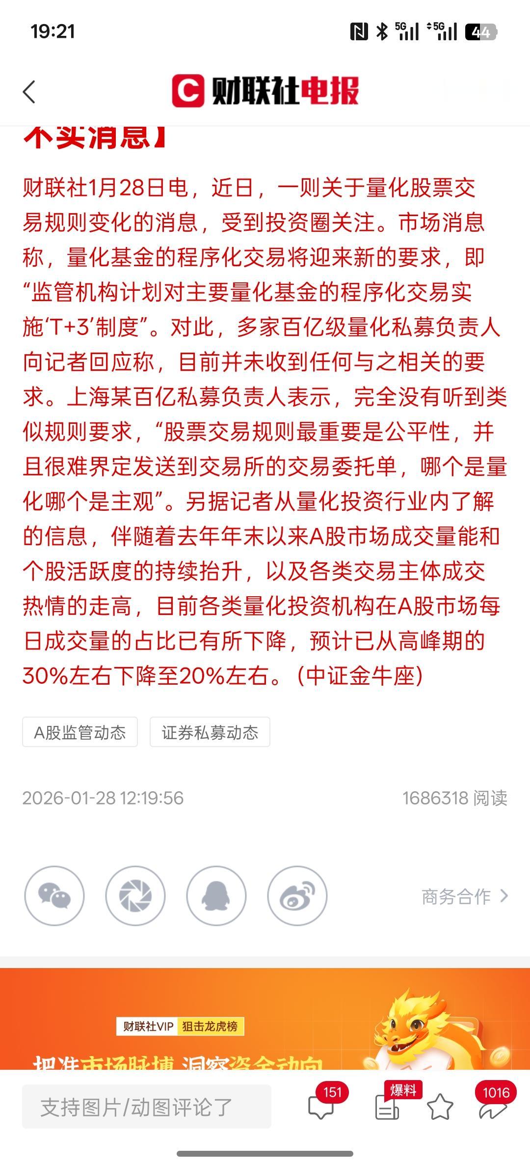 量化机构说股票的交易规则重要是在于公平性?如果机构与量化能够实现t+3的规则交易方式,那绝对利好资本市场!利好市场长期价值投资! 多家头部量化机构回应:“量化股票交易规则或变化”为不实消息! 根据这些量化机构所说的股票重在于交易规则的公平性?那请问一下,什么叫公平机构与量化是有多么大的优势,而散户公平吗?散户t+1机构t+0每分钟可以交易多少笔单子?这就是所谓的公平? 说出这样的话,也不怕把腰闪着! 那非要讲究公平性,散户有什么优势?资金优势没有,信息渠道,消息面的优势没有,交易方式的优势没有!这叫股票与规则在于交易公平性吗?
