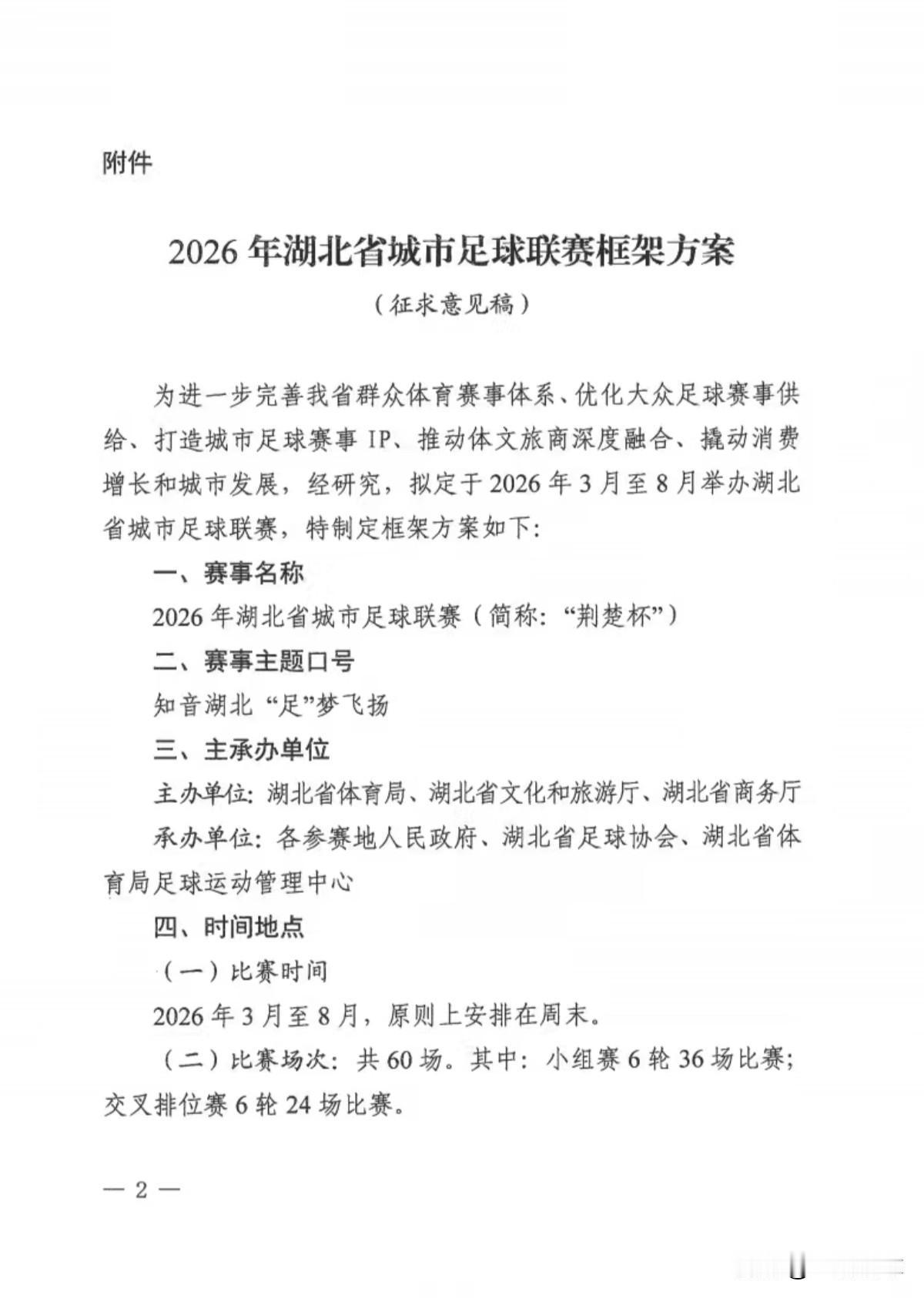鄂超来了,不过叫“荆楚杯”!你期待不? 近日,湖北省体育局向各地市州下发了关于征求2026年湖北省城市足球联赛框架方案意见的函,文中写到:拟于2026年3月-8月举办2026年湖北省城市足球联赛(简称:“荆楚杯”)。 一共有12支球队参赛,包含孝感市、荆州市、鄂州市、黄石市、十堰市、襄阳市、黄冈市、潜江市、宜昌市等9支市级代表队,2支2025赛季汉超冠亚军球队东湖高新区、江岸区,1支附加赛球队(荆门市VS汉超季军蔡甸区之间的胜者)。 这两天已经看到各级地市在发英雄贴摇人了,由于武汉不单独派市级队参赛,估计有很多汉超或更多外地高水平球员分流进各队。让我们拭目以待吧!
