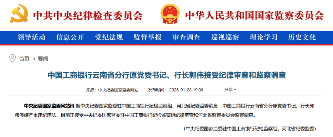 1月28日,中央纪委国家监委官网通报称,中国工商银行云南省分行原党委书记、行长郭伟涉嫌严重违纪违法,目前正接受中央纪委国家监委驻中国工商银行纪检监察组纪律审查和河北省监察委员会监察调查。