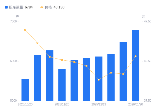 日期A股户数(户)流通A股户均持股数(股)户均持股市值(万元)2026-01-2067844618.0019.922026-01-0964904827.2019.732025-12-3161805069.3420.812025-12-1961185120.7120.572025-12-1060895145.1021.562025-11-2860225202.3422.062025-11-2058065395.8823.022025-11-1062774991.0021.482025-10-3161575088.2722.812025-10-2055575637.6626.19